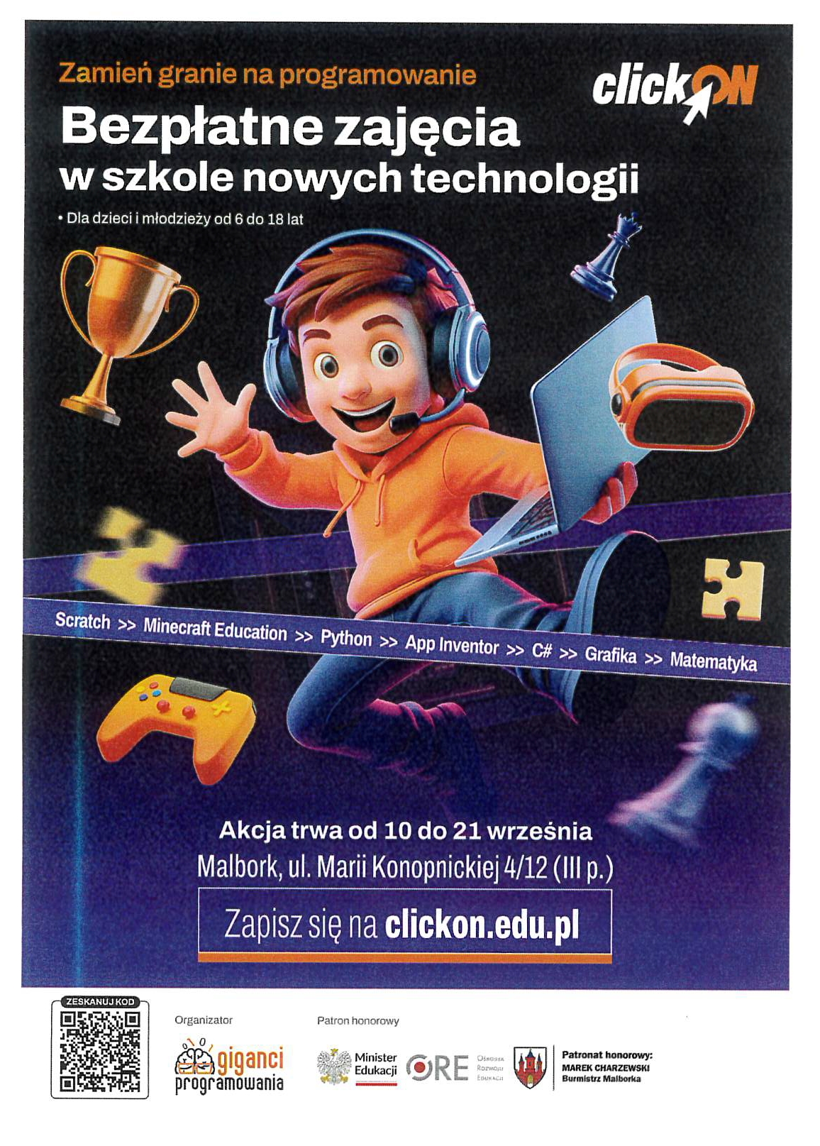 Z radością informujemy, że nasza szkoła wspiera projekt clickON – "Zamień granie na programowanie", który otwiera przed Waszymi dziećmi wyjątkową możliwość nauki programowania i zdobycia praktycznych umiejętności potrzebnych w cyfrowym świecie.