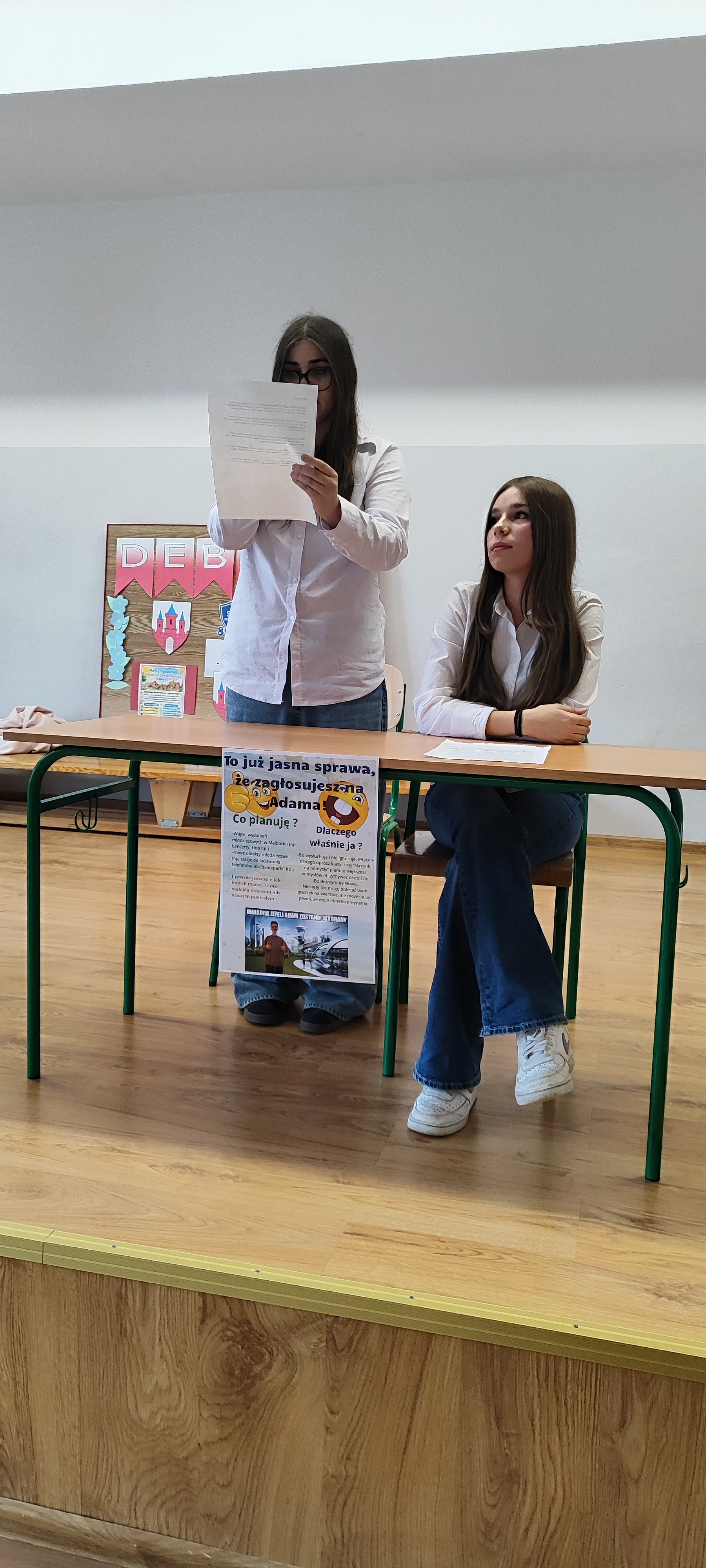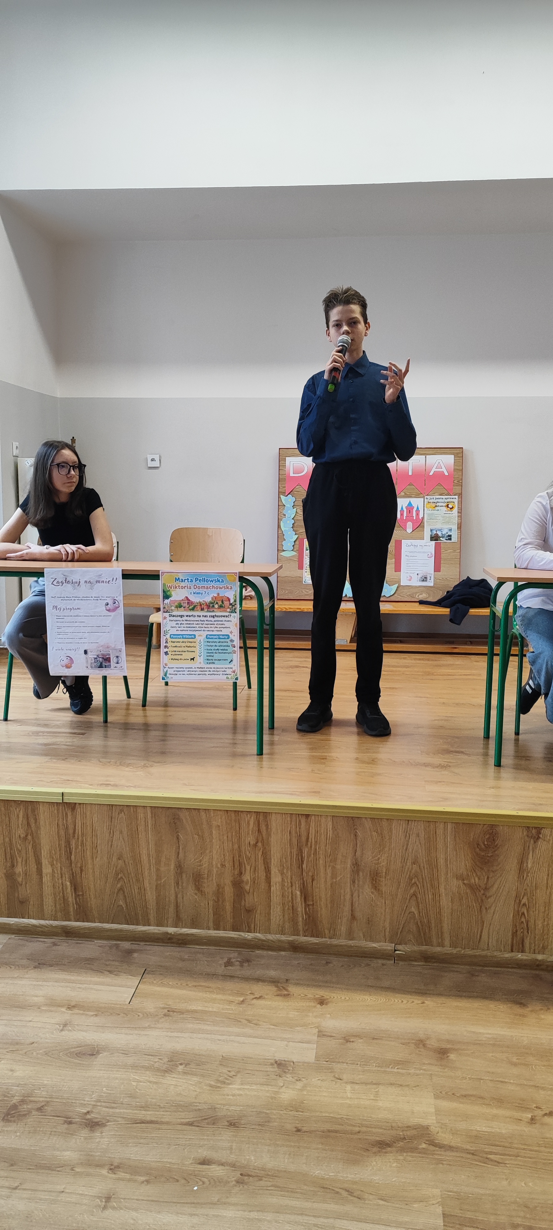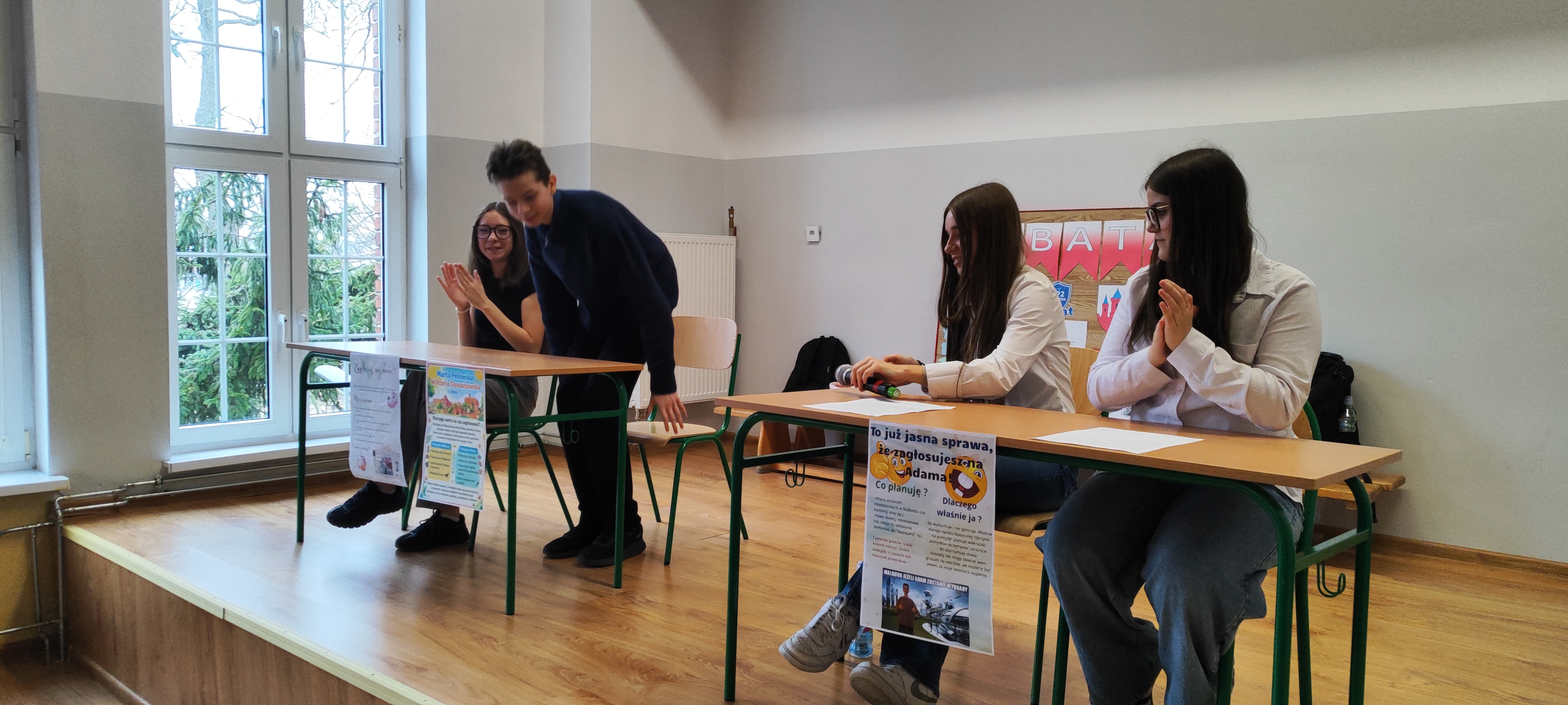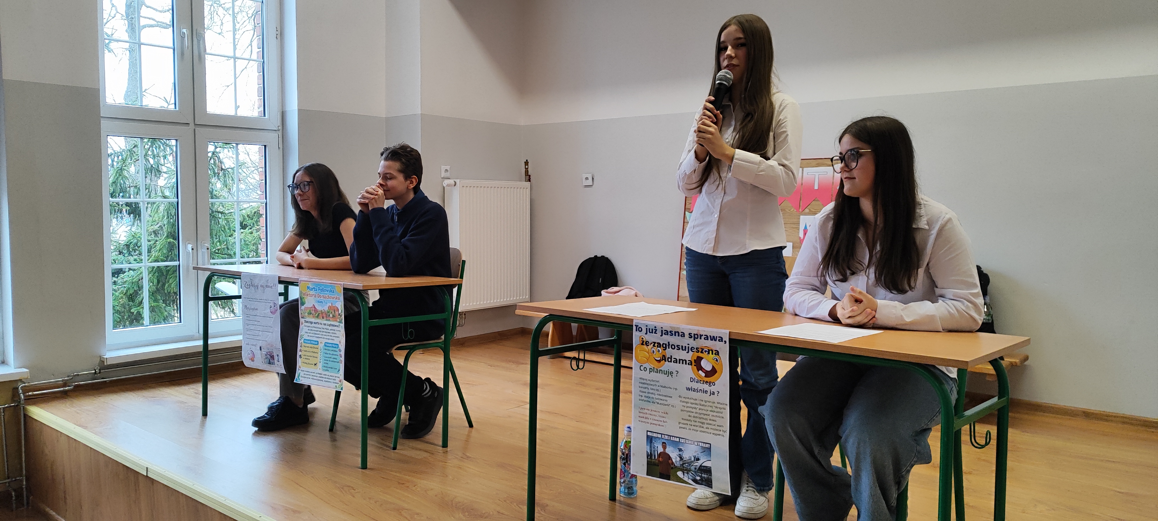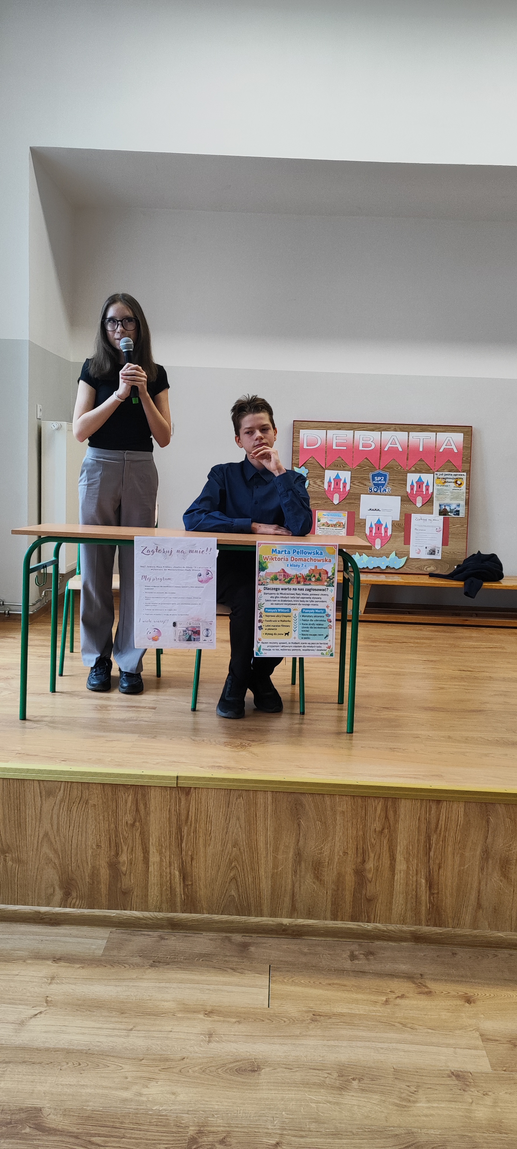 Przed każdymi wyborami warto przeprowadzić debatę, aby kandydaci mogli zaprezentować dokładniej swoje pomysły a wyborcy lepiej poznali samych kandydatów. Tak też było w naszej Szkole. Przed wyborami do Młodzieżowej Rady Miasta Samorząd Uczniowski zorganizował debatę. Czworo kandydatów zaprezentowało swoje pomysły wyborcze. Po kilku słowach wstępu każdy z nich odpowiadał na pytania uczniów. Mimo początkowej tremy, kandydaci szybko złapali dobry kontakt z przyszłymi wyborcami, a ich wypowiedzi kończyły się brawami.