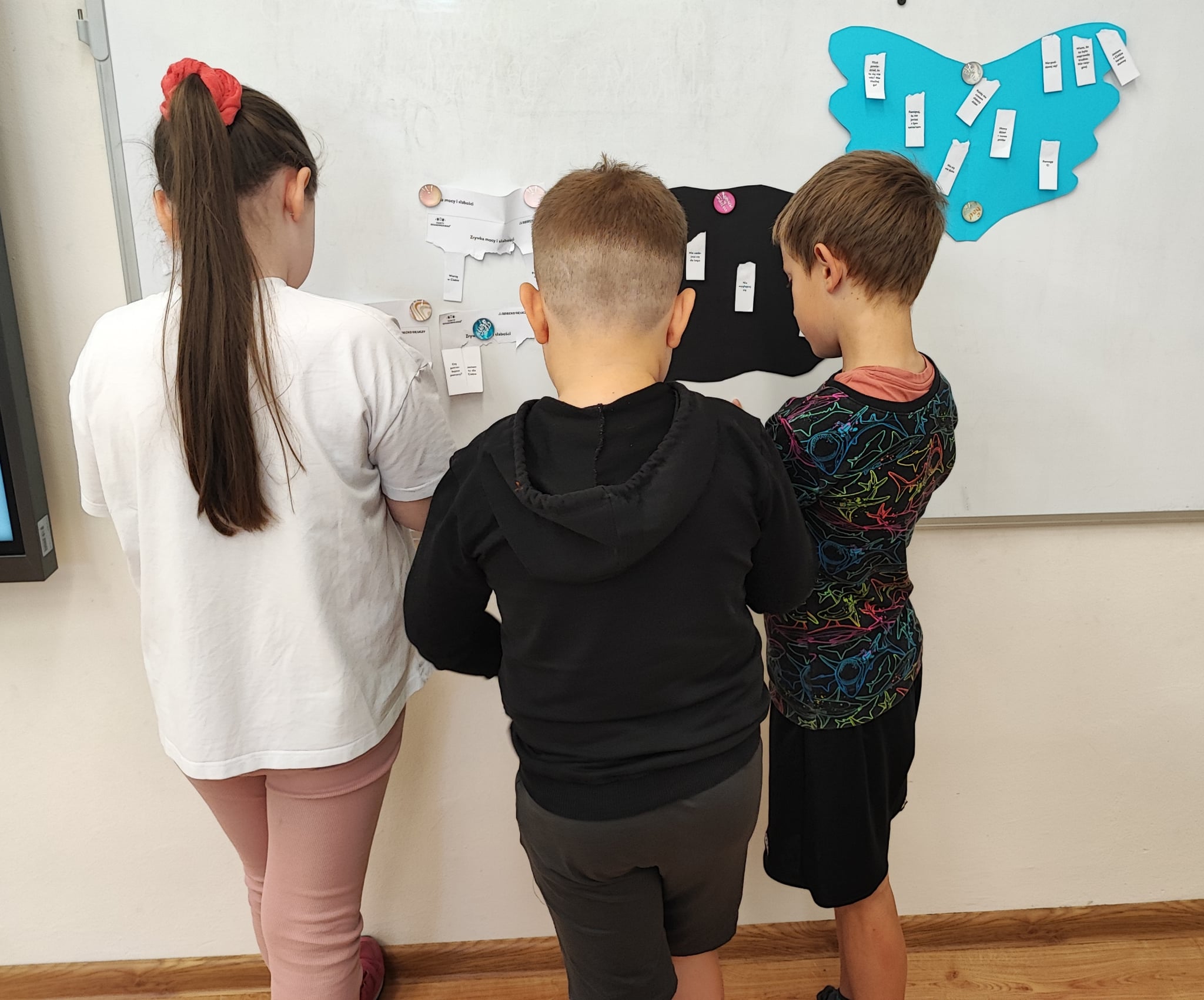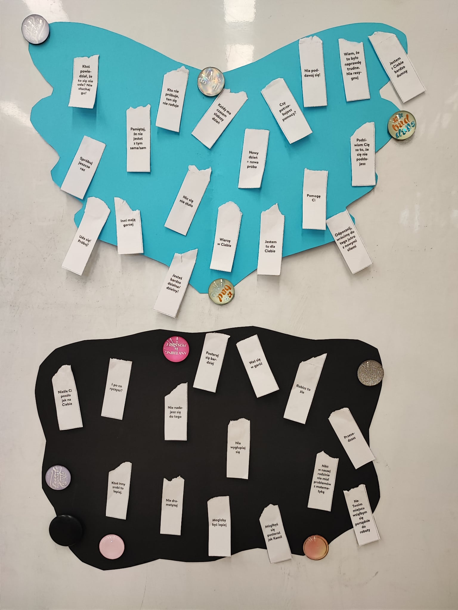 Wszyscy doszli do wniosku, że słowa mają moc. Są takie, które „dodają skrzydeł”, ale i takie, które, gdy usłyszymy – wpędzają w „czarną dziurę”. Uczniowie mieli przygotowane „zrywki” i doklejali je do skrzydeł lub czarnej dziury.