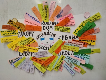 Najpierw zostały stworzone obszary, w których można zaznać tego uczucia, a potem dzieci dopisywały na kolorowych karteczkach osoby i sytuacje. Powstało wielobarwne słoneczko.