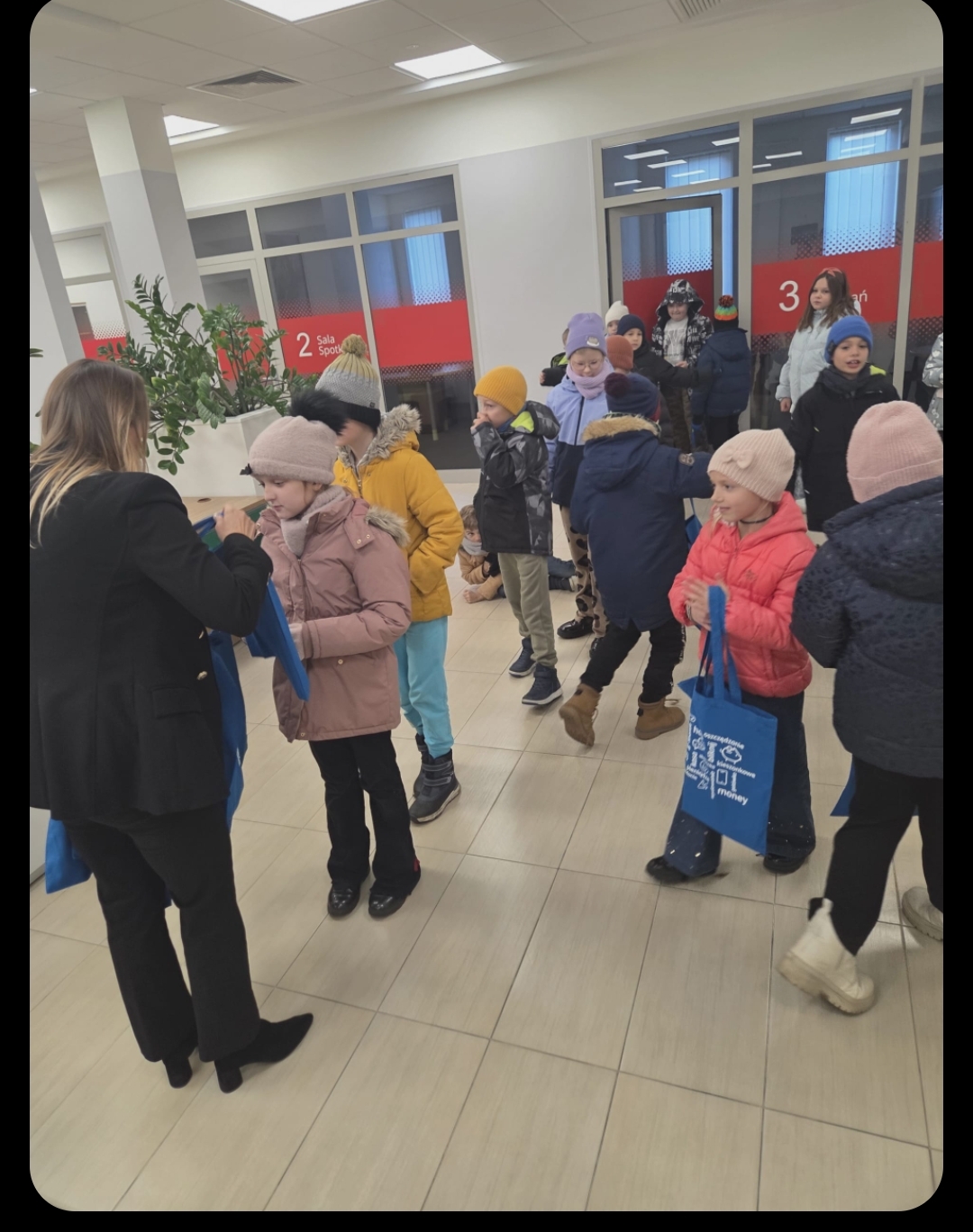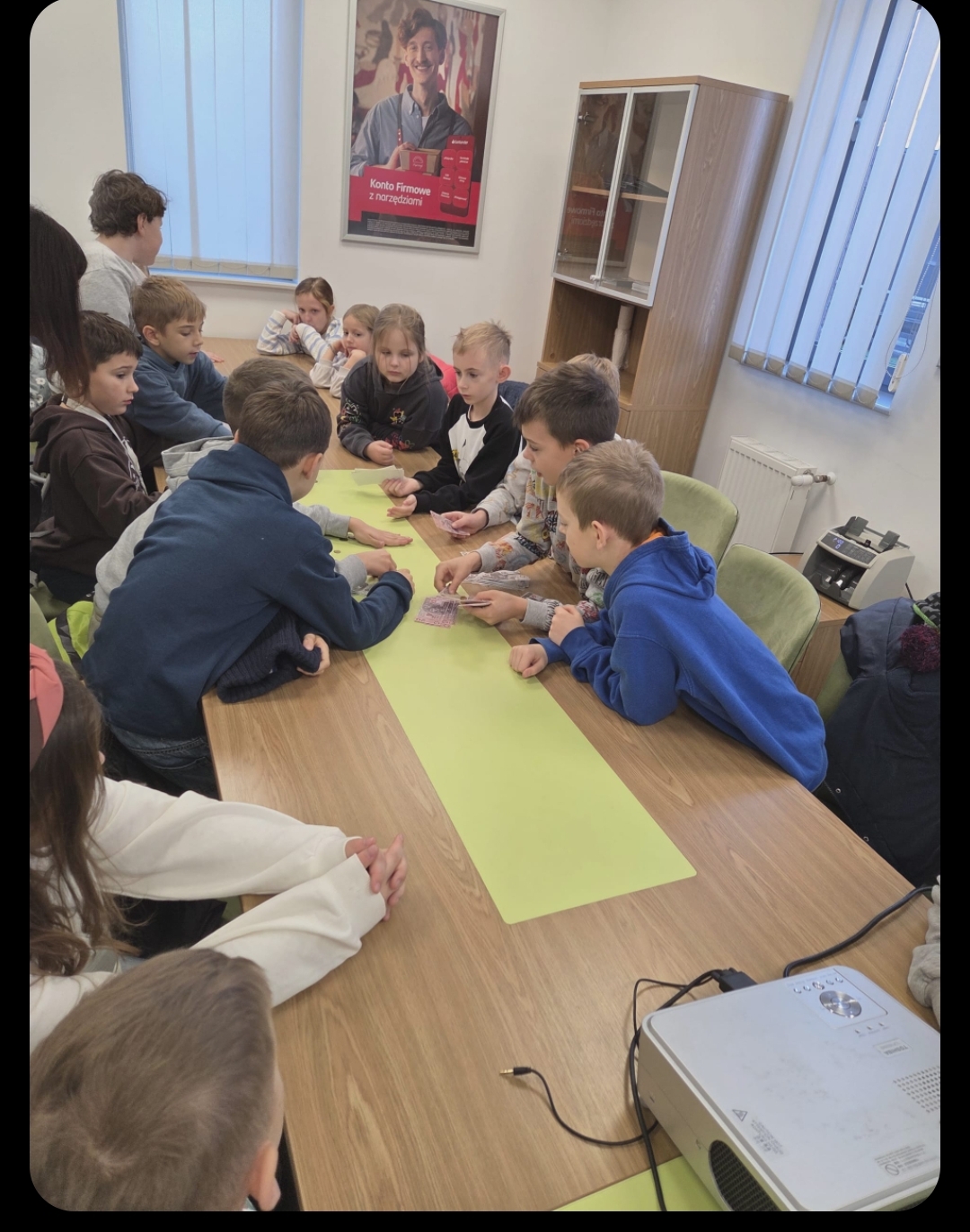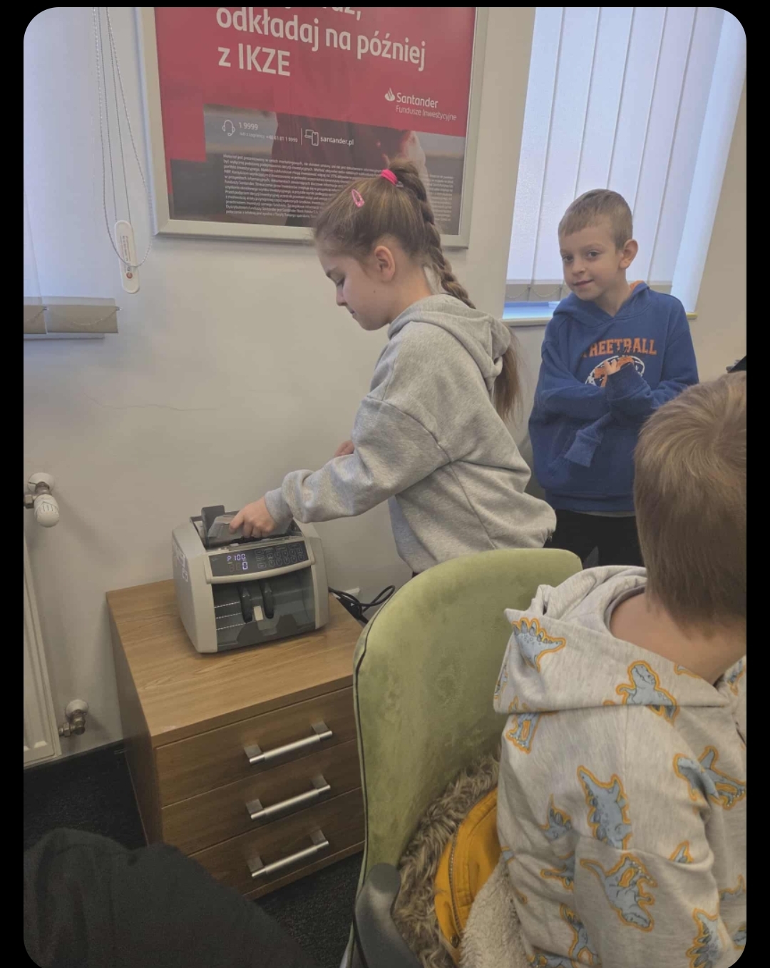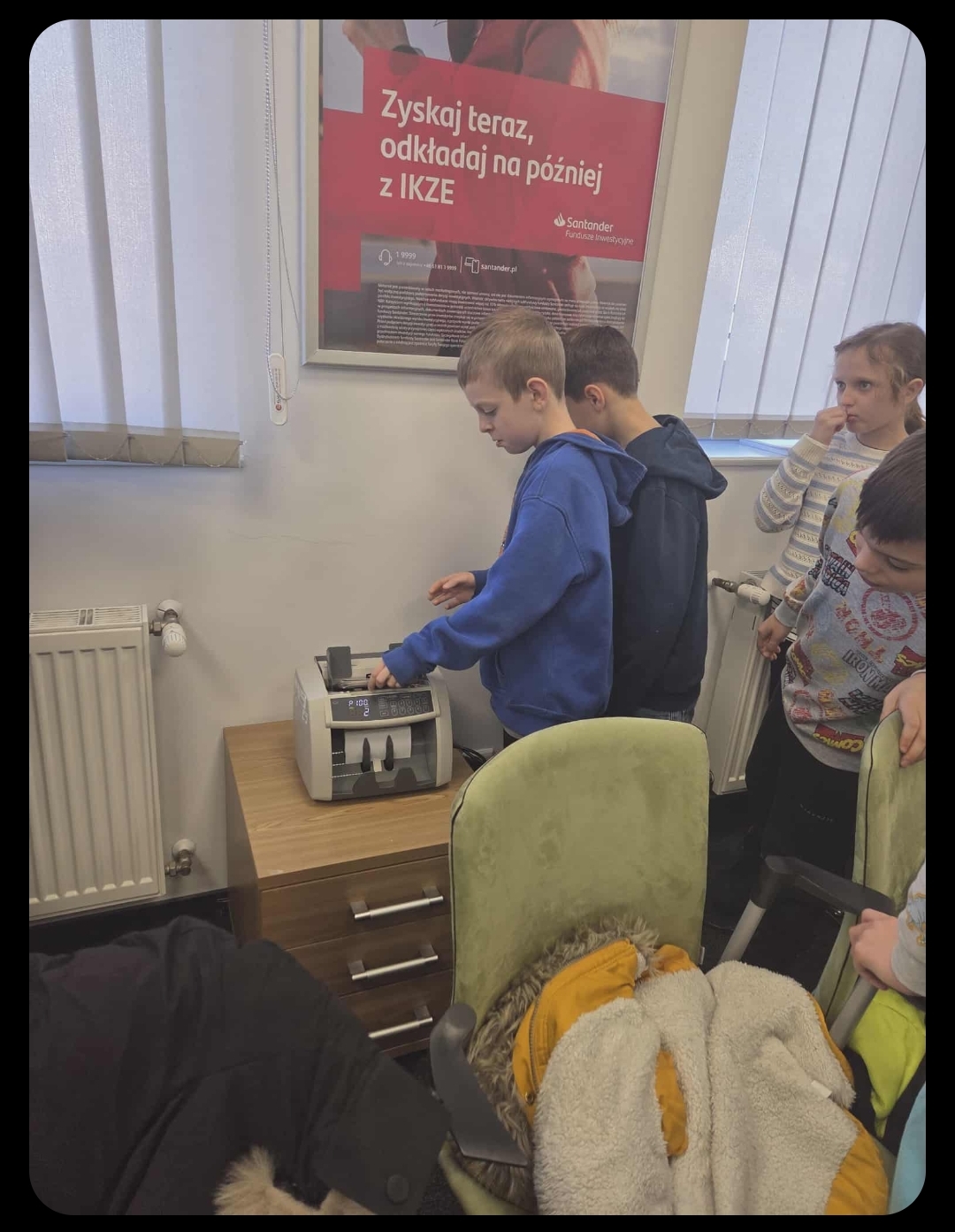 21.11.2025r klasa 2b była na lekcji finansowej w Santander Bank Polska S.A. Dzieci dzięki specjalistom bankowości zapoznały się nie tylko z historią pieniądza i handlu, ale również z podstawowymi pojęciami związanymi z bankowością: rodzaje monet, banknotów, jakie zabezpieczenia stosowane są w banku. Dowiedzieli się też o formach oszczędzania, zaletach, ale i zagrożeniach płynących z korzystania z bankowych usług internetowych. Każdy miał możliwość zobaczyć, jak działa urządzenie, dzięki któremu można szybko i sprawnie przeliczyć większą liczbę banknotów. Dzieci bawiły sie w wymianę towarową, dokonywały zakupów produktów pierwszej potrzeby za określoną kwotę. Na koniec zajęć uczniowie wzięli udział w quizie z pozyskanej wiedzy. Dzieci na koniec dostały drobne upominki, które sprawiły im wielką radość.