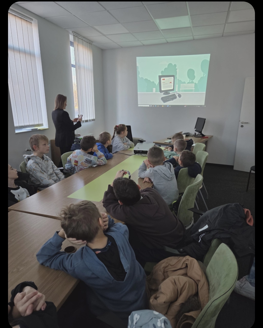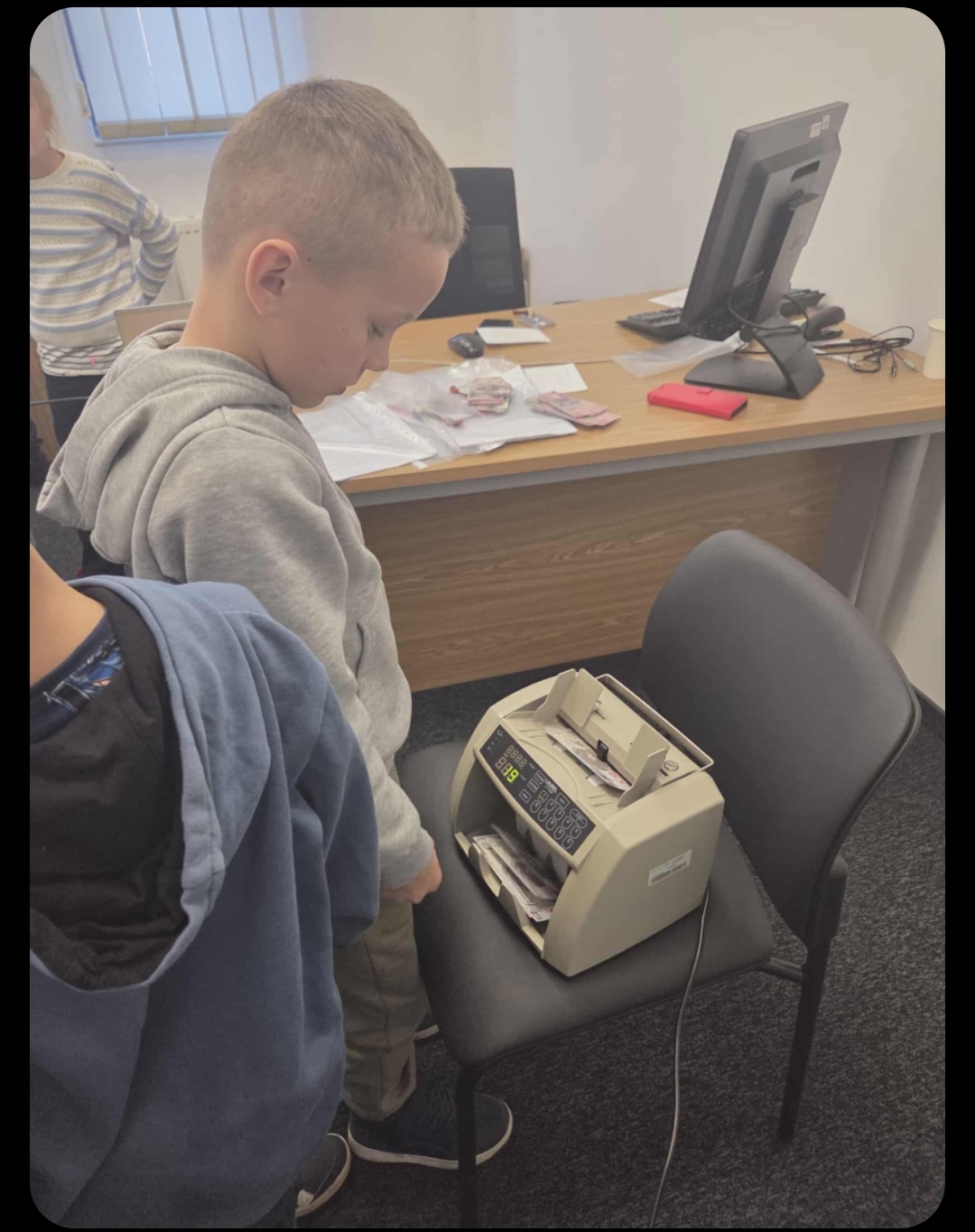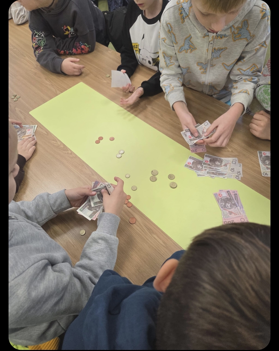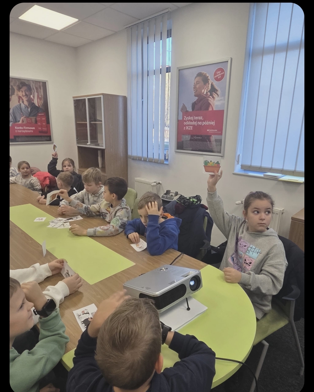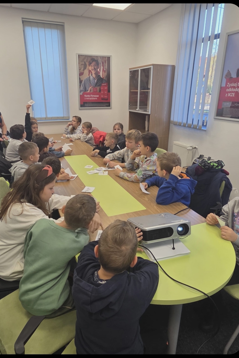 21.11.2025r klasa 2b była na lekcji finansowej w Santander Bank Polska S.A. Dzieci dzięki specjalistom bankowości zapoznały się nie tylko z historią pieniądza i handlu, ale również z podstawowymi pojęciami związanymi z bankowością: rodzaje monet, banknotów, jakie zabezpieczenia stosowane są w banku. Dowiedzieli się też o formach oszczędzania, zaletach, ale i zagrożeniach płynących z korzystania z bankowych usług internetowych. Każdy miał możliwość zobaczyć, jak działa urządzenie, dzięki któremu można szybko i sprawnie przeliczyć większą liczbę banknotów. Dzieci bawiły sie w wymianę towarową, dokonywały zakupów produktów pierwszej potrzeby za określoną kwotę. Na koniec zajęć uczniowie wzięli udział w quizie z pozyskanej wiedzy. Dzieci na koniec dostały drobne upominki, które sprawiły im wielką radość.