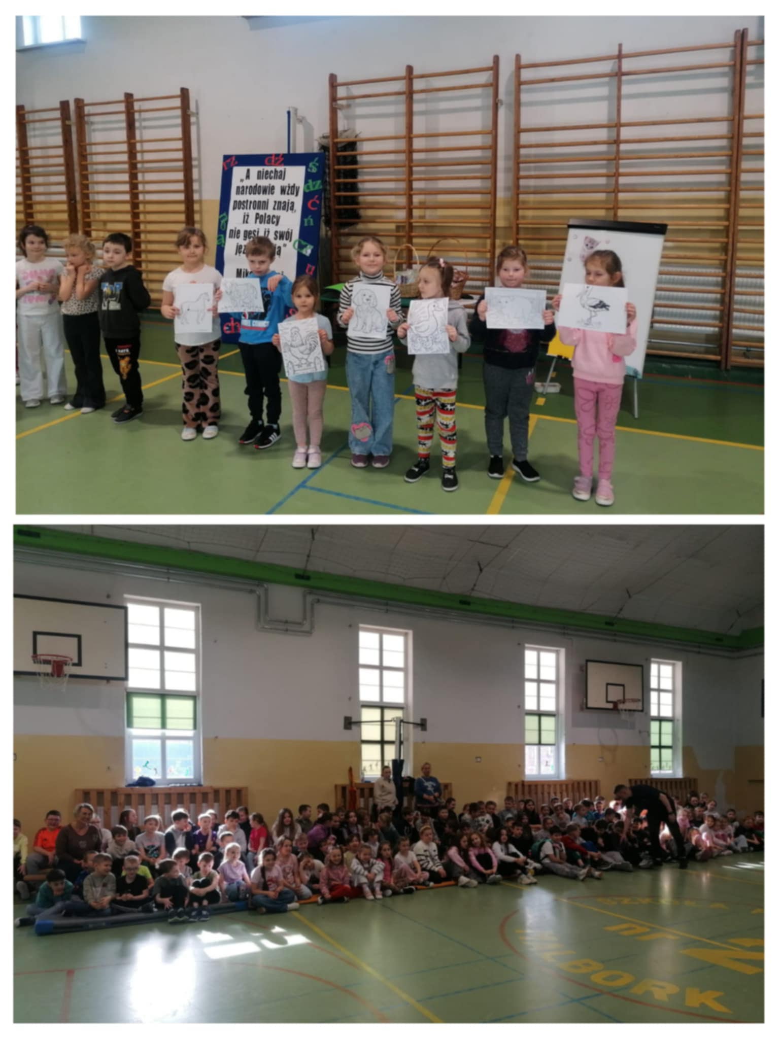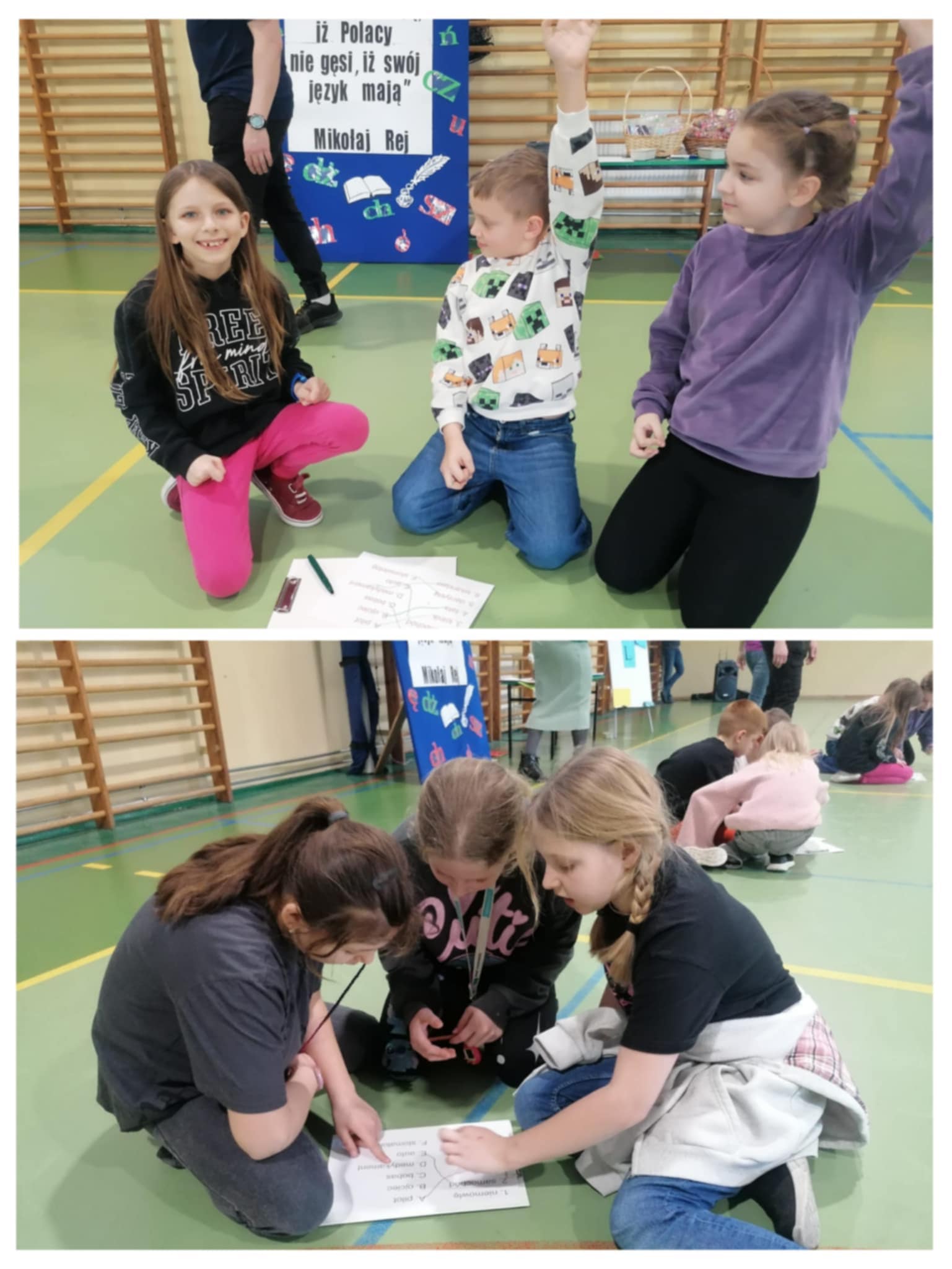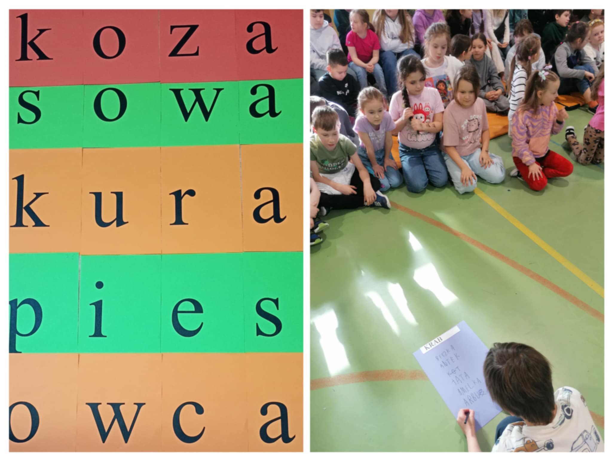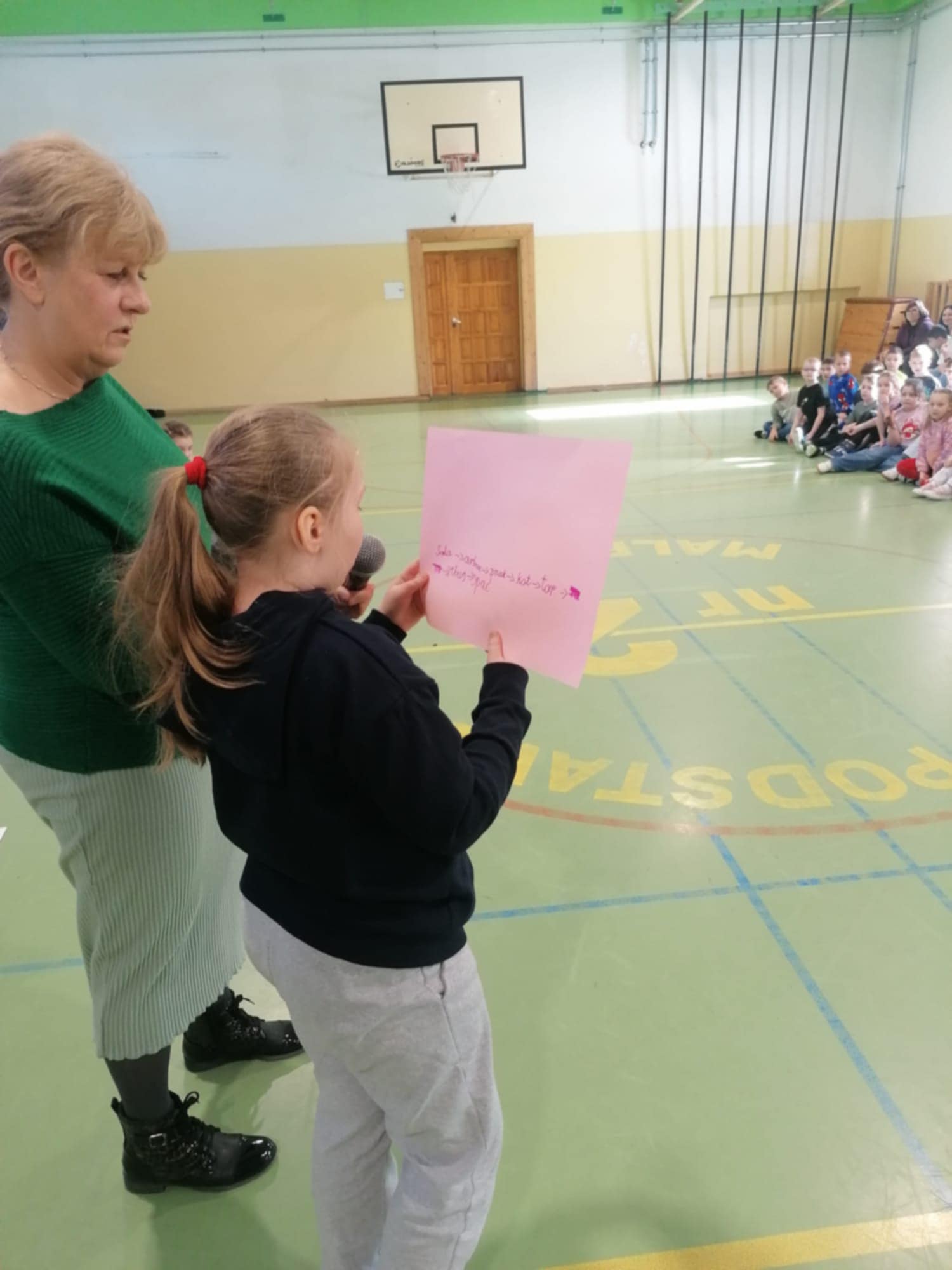 W piątek 20 lutego w grupie wiekowej 0-3 odbyły się szkolne zabawy językiem polskim z okazji "Międzynarodowego Dnia Języka Ojczystego". Uroczystość poprowadziły p.Magdalena Karch oraz p.Emilia Łęczkowska. Tego dnia w sali gimnastycznej zrobiło się gwarno i wesoło. Dzieci z oddziału przedszkolnego miały do wykonania dwa zadania - pierwsze zadanie pn."Literkowe figury", które polegało na ułożeniu na podłodze kształt wylosowanych liter "L", "T", "O" przy użyciu własnych ciał. Druga zabawa to zabawa w kalambury dźwiękowe, w której dzieci losowały kartki z obrazkiem zwierząt i musiały przekonać grupę, kim są, używając wyłącznie dźwięków jakie wydają zwierzęta. Wszystkie klasy w przerwach między poszczególnymi klasami recytowały hasło przewodnie spotkania, które brzmiało "Język polski nasz ojczysty każdy dźwięk jest barwny, czysty, szeleścimy, rymujemy i polszczyznę miłujemy". Klasy pierwsze musiały zmierzyć się z zabawą pt. "Sałatka literowa"- z rozsypanych liter układali jak najwięcej nazw zwierząt w określonym czasie. Kolejne zadanie jakie mieli do wykonania pierwszoklasiści to był tak zwany "Łańcuch", czyli tworzenie łańcucha wyrazów poprzez dopisywanie wyrazu zaczynającego się na ostatnią literę poprzedniego. Kolejna konkurencja polegała na kończeniu przez uczniów danej klasy wersu ze znanego wierszyka. np. "Nad rzeczką opodal krzaczka…", "Na tapczanie siedzi leń...". Klasy drugie musiały zmierzyć się z zabawą "To samo, ale inaczej", czyli połączeniu w pary słowa o tym samym znaczeniu. np. ubranie-strój, lotnik-pilot, bobas-niemowlę czy dentysta-stomatolog. Druga zabawa dla drugoklasistów nosiła nazwę "Budowniczy" i polegała na utworzeniu jak największej liczby wyrazów z wylosowanego przez klasę wyrazu, "kolorowanka", "latarka", "lokomotywa", "telewizor" lub "parasolka". Klasy trzecie miały trudniejsze zadania bo z zabawie "Lekarz przysłów" prowadząca czytała dane przysłowie z błędem, a uczniowie mieli za zadanie poprawić je np. "Gdyby kózka nie skakała, toby płakała", "Gdzie dwóch się bije, tam trzeci... ma siniaka", "Kto pod kim dołki kopie, ten jest górnikiem”. Kolejna konkurencja dla trzecioklasistów nosiła nazwę "Mistrz łamańców językowych", czyli konkurs recytatorski z humorem, w której to dzieci losowały kartki i musiały bezbłędnie powiedzieć dane zdanie, np. "W Szczebrzeszynie chrząszcz brzmi w trzcinie", "Stół z powyłamywanymi nogami", "Król Karol kupił królowej Karolinie korale koloru koralowego", "W czasie suszy szosa sucha", "Rewolwerowiec wyjął z kabury rewolwer". "Wymienianka" była ostatnią konkurencją z pośród wszystkich zabaw, która polegała na dokończeniu czytanego przez prowadzącego zdania wyrazem, który będzie zawierał odpowiednią trudność ortograficzną – „ó” np. "Wielka broda – mała...", "Dojna krowa – boża...". Na koniec każda klasa otrzymała dyplom, ołówki dla każdego ucznia oraz słodkie upominki ufundowane przez Radę Rodziców naszej szkoły. Podziękowania dla p. Małgorzaty Gutowskiej-Janiuk za wykonanie dekoracji, p. Annie Osipiak za wykonanie zdjęć oraz p.Maciejowi Klocowi za odpowiednie nagłośnienie podczas imprezy. Tekst: Emilia Łęczkowska, Magdalena Karch.