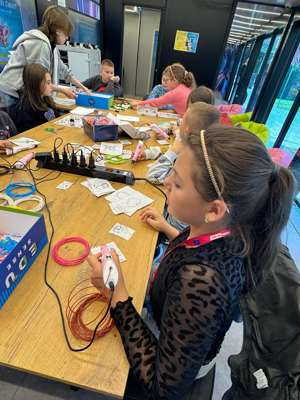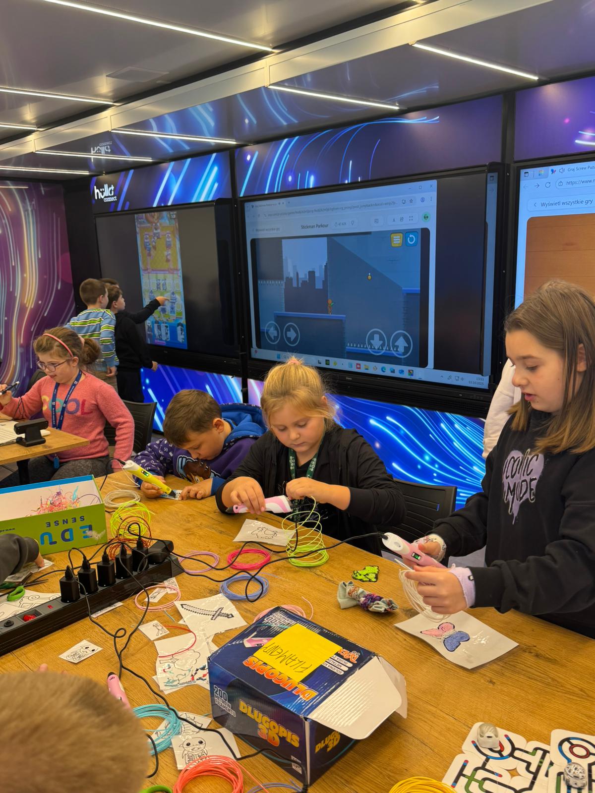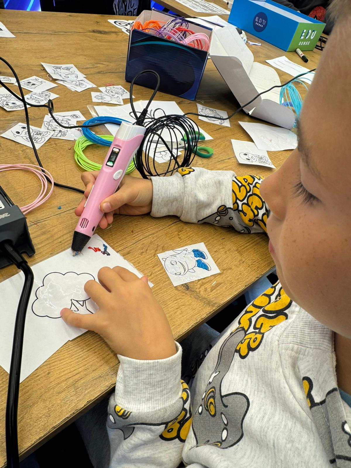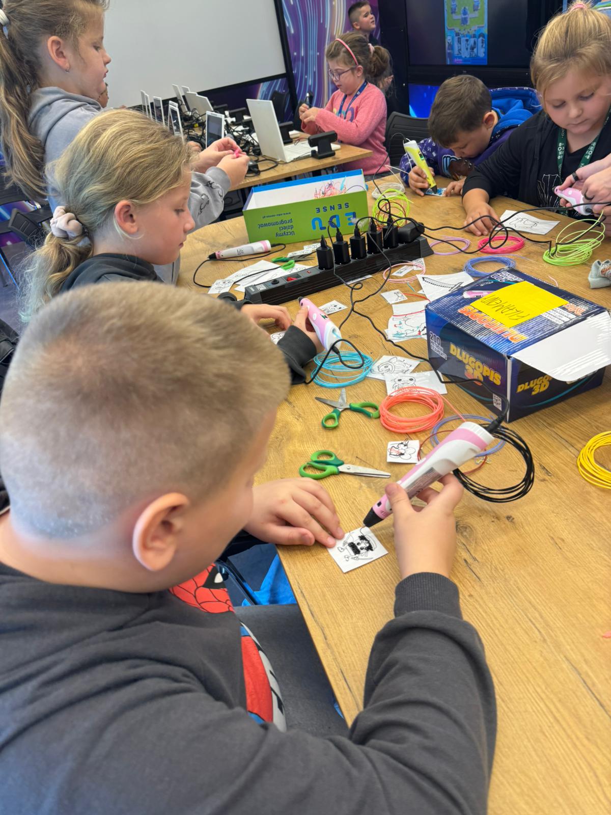 Podczas warsztatów dzieci miały okazję pracować z nowoczesnymi technologiami, takimi jak długopisy 3D, ekrany multimedialne oraz komputery z interaktywnymi długopisami. Zajęcia nie tylko rozwijały kreatywność i zdolności manualne uczniów, ale także inspirowały ich do poznawania świata nauki w nowoczesny i angażujący sposób.
