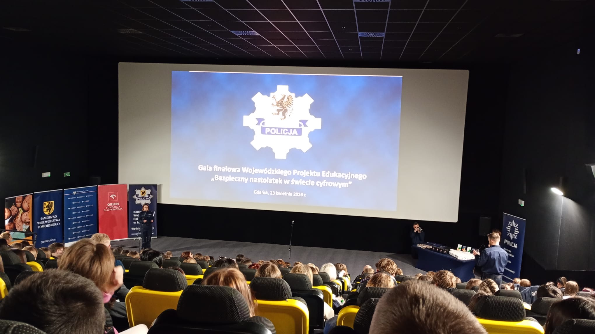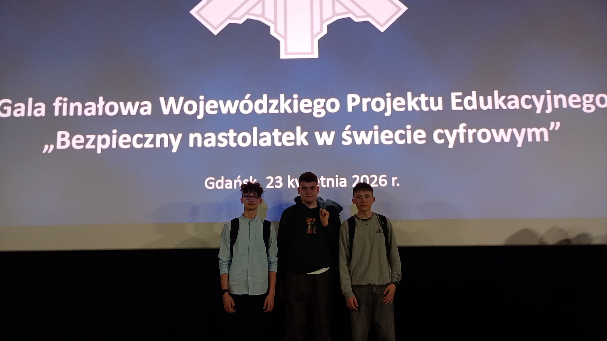 W czwartek 23.04.2026 roku uczniowie naszej szkoły pod opieką pedagoga szkolnego wybrali się do Gdańska, gdzie uczestniczyli w gali finałowej podsumowującej Wojewódzki Pilotażowy Projekt Edukacyjny pn. „Bezpieczny nastolatek w świecie cyfrowym”. Konkurs podsumowywały insp. Anna Kos I Zastępca Komendanta Wojewódzkiego Policji w Gdańsku wraz z II Wicewojewodą Pomorską Anną Olkowską – Jacyno. Wydarzenie organizowane było przez Komendę Wojewódzką Policji w Gdańsku i polegało na nagraniu spotu edukacyjnego na temat szeroko rozumianego bezpieczeństwa w świecie cyfrowym.