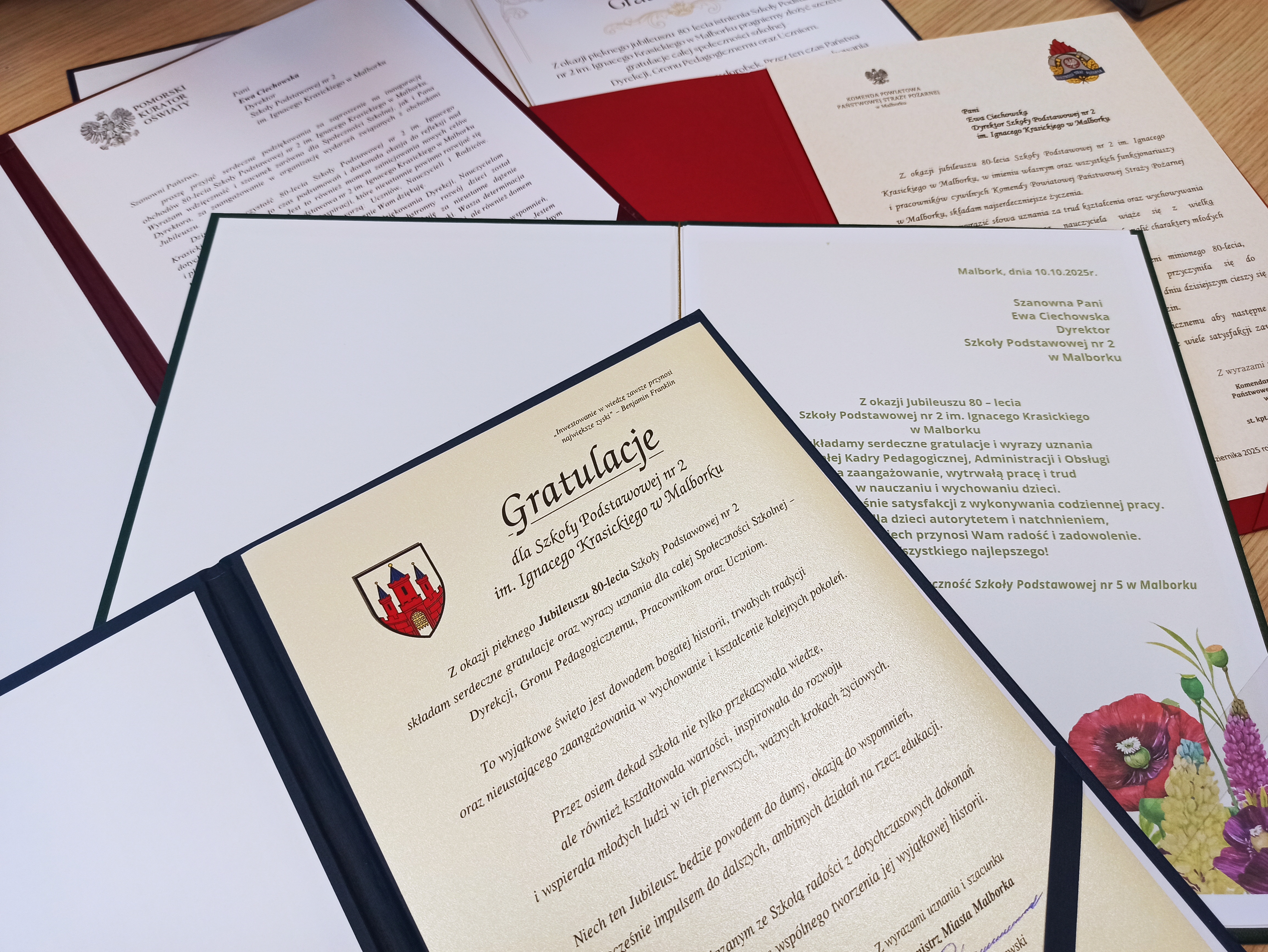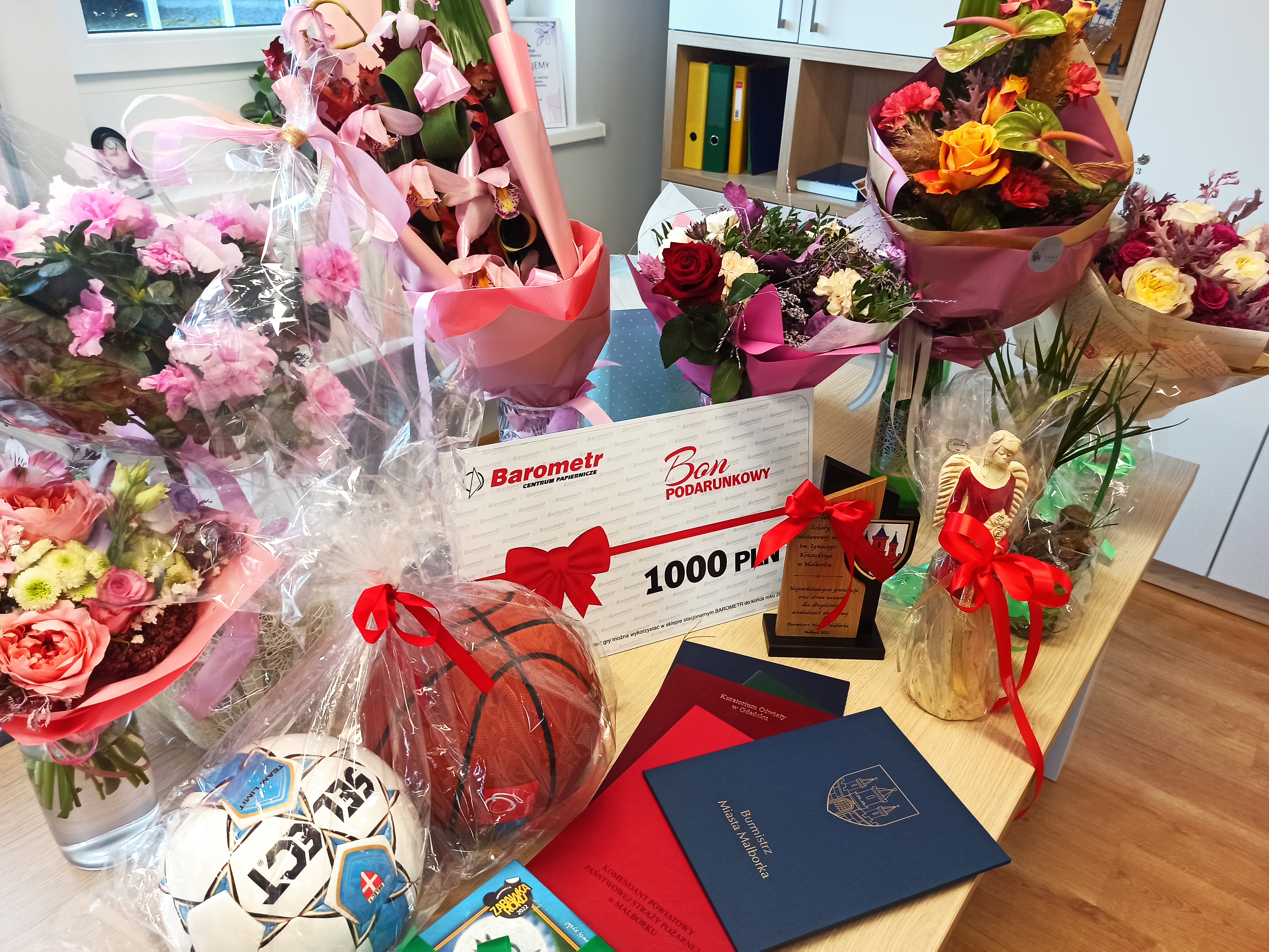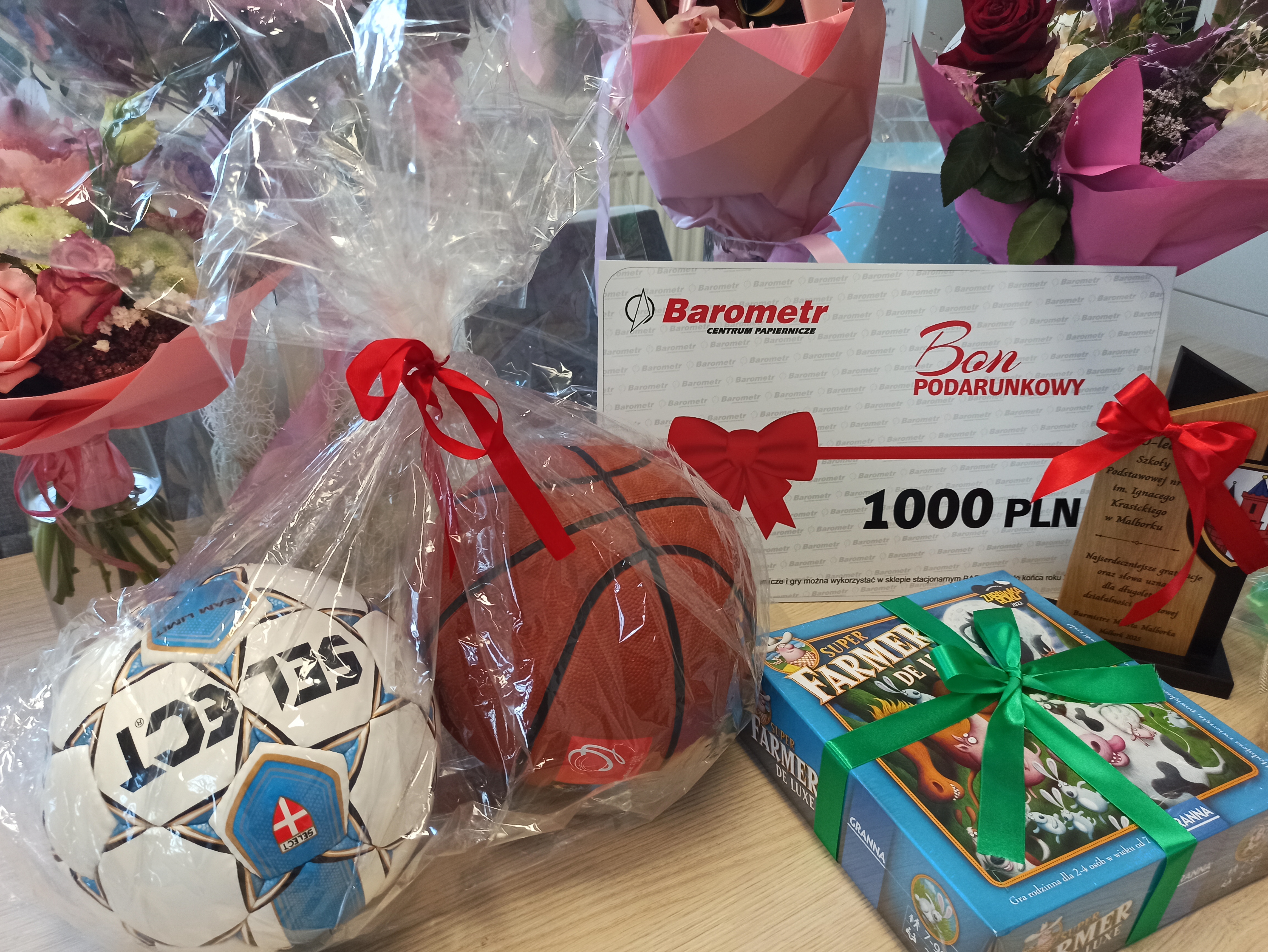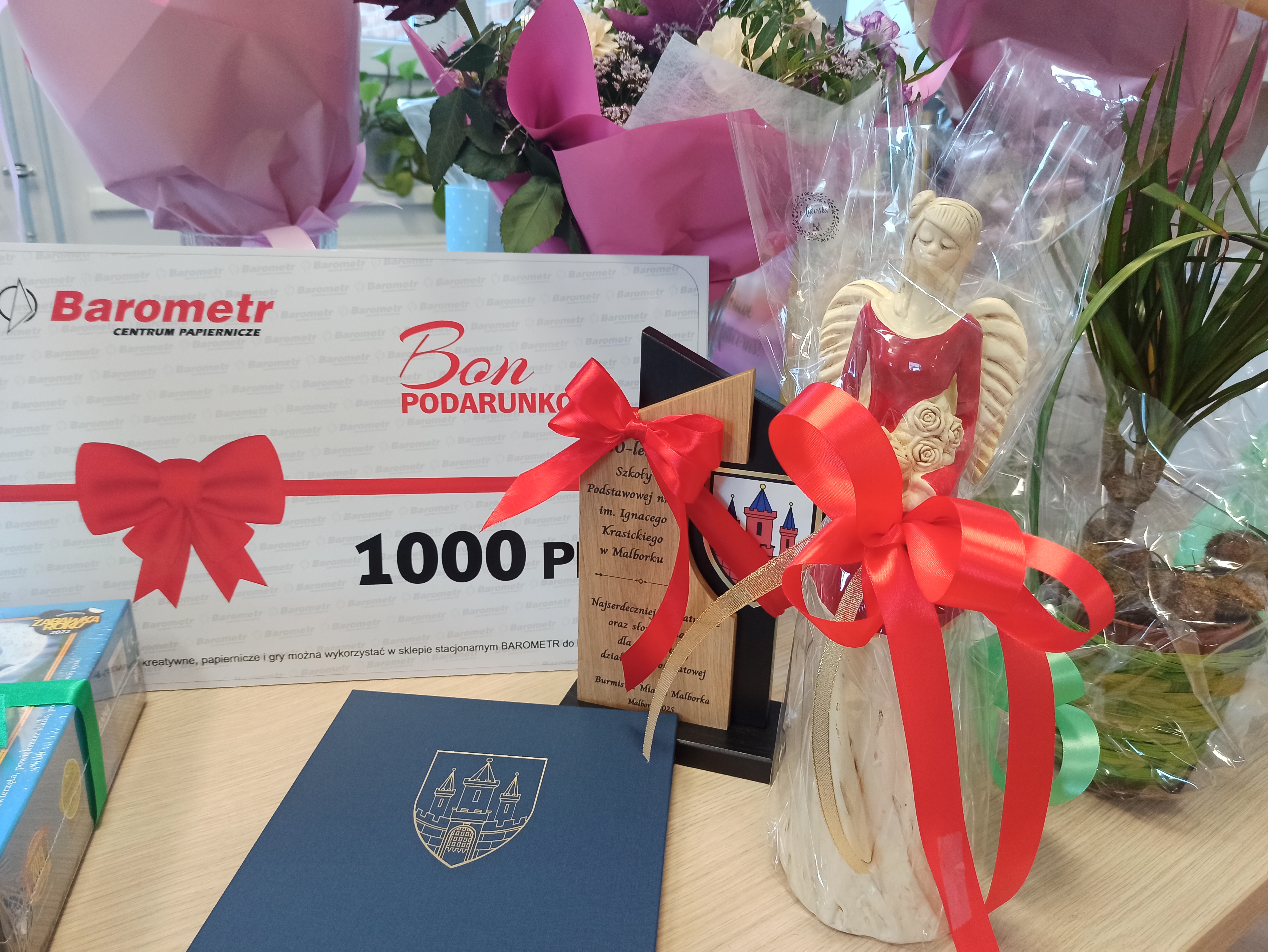 Gratulacjom i serdecznościom nie było końca, a dowodem na to są prezenty i kwiaty, które możemy zobaczyć na poniższych zdjęciach. Pomoce dydaktyczne już „hulają” po szkole, a bukiety i okolicznościowe życzenia cieszą nasze oko i napawają dumą.
