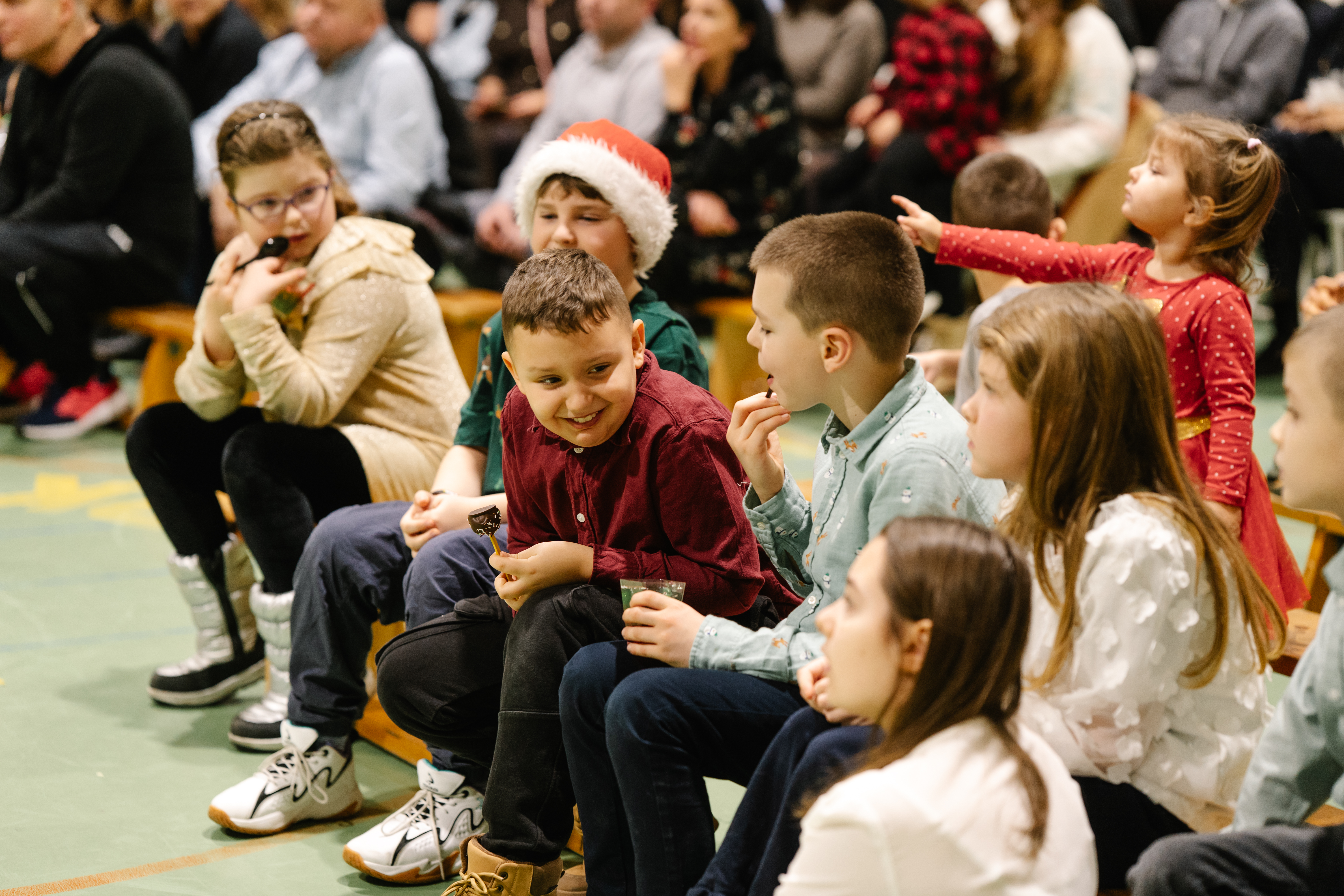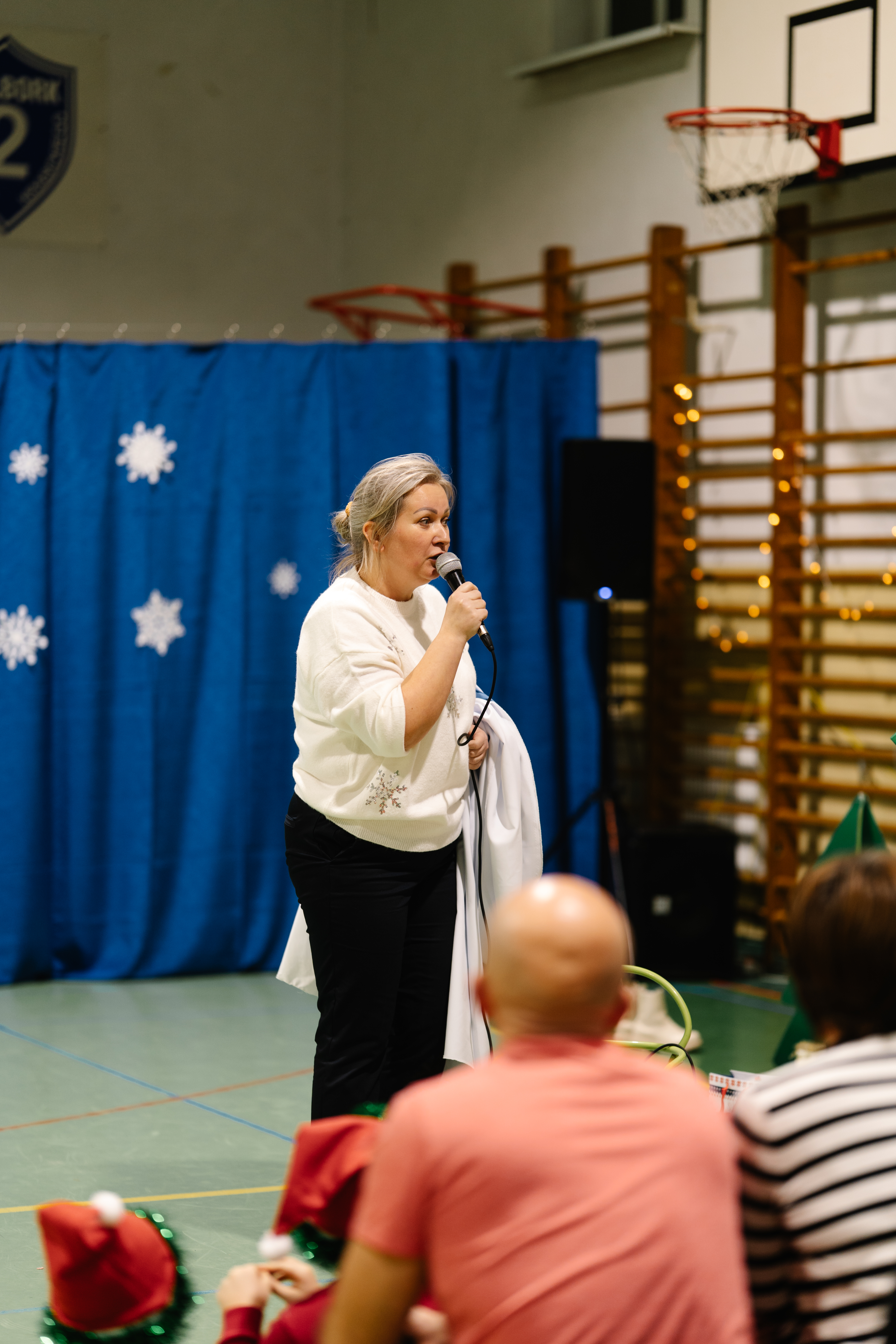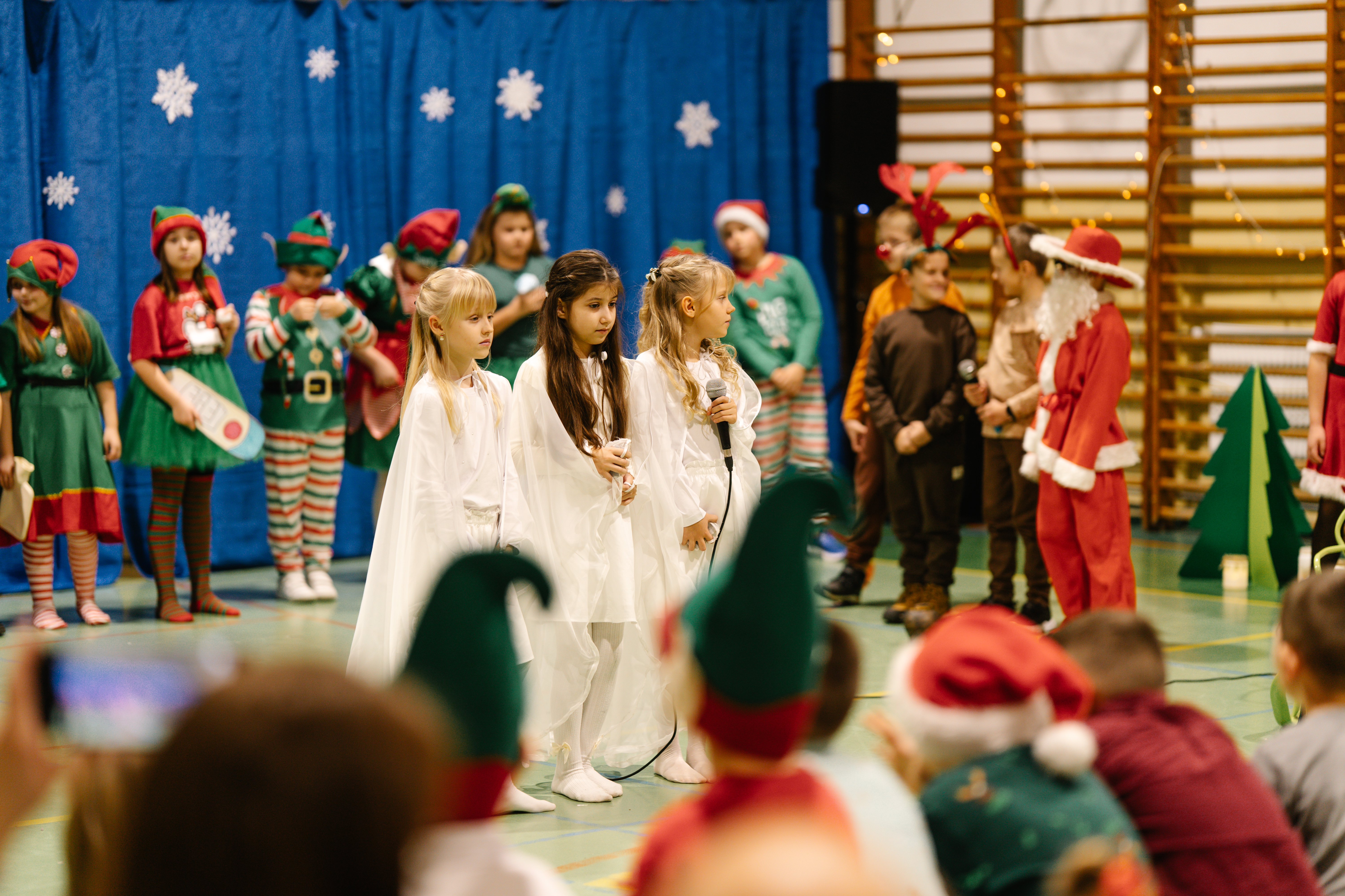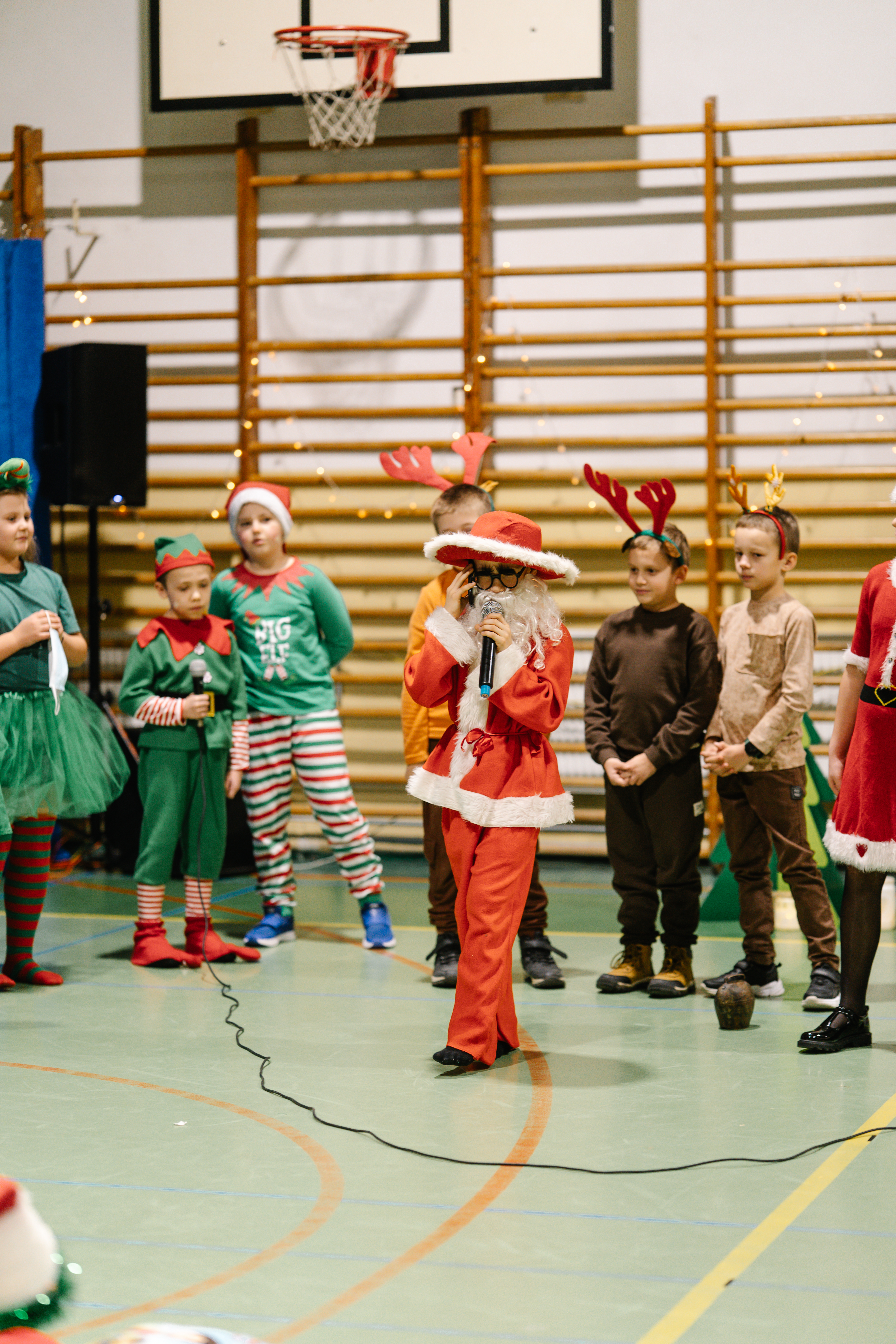 W ciepłej, świątecznej atmosferze, na udekorowanej sali gimnastycznej odbyło się wyjątkowe spotkanie świąteczne klas 2a, 2b i 2c z rodzicami. Już od progu uwagę przyciągały kolorowe dekoracje: migoczące lampki, papierowe gwiazdy oraz choinka. Na twarzach dzieci widać było lekką tremę, ale też ogromną radość – tego popołudnia miały bowiem zaprezentować długo przygotowywane przedstawienie pt. „Chore elfy”.