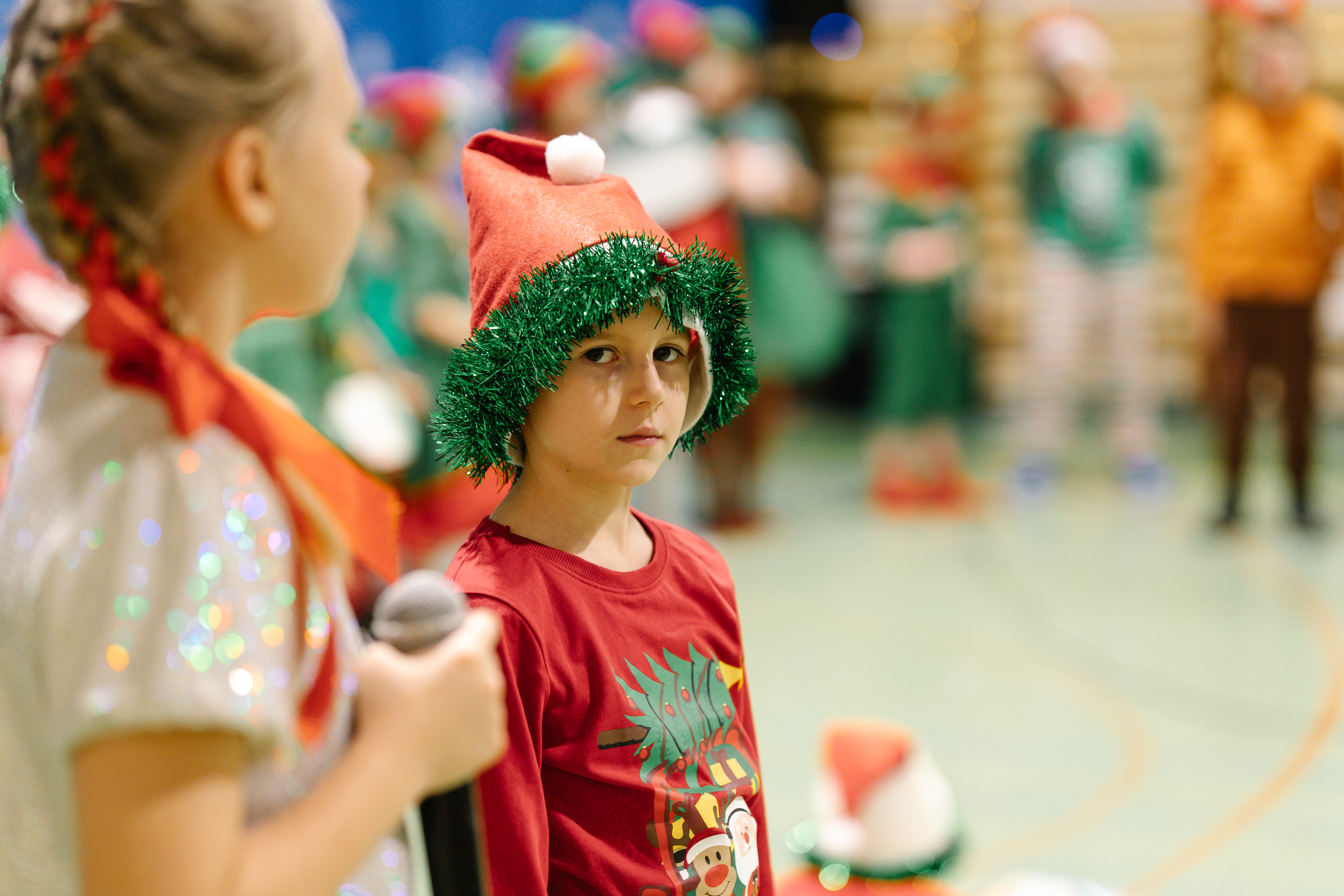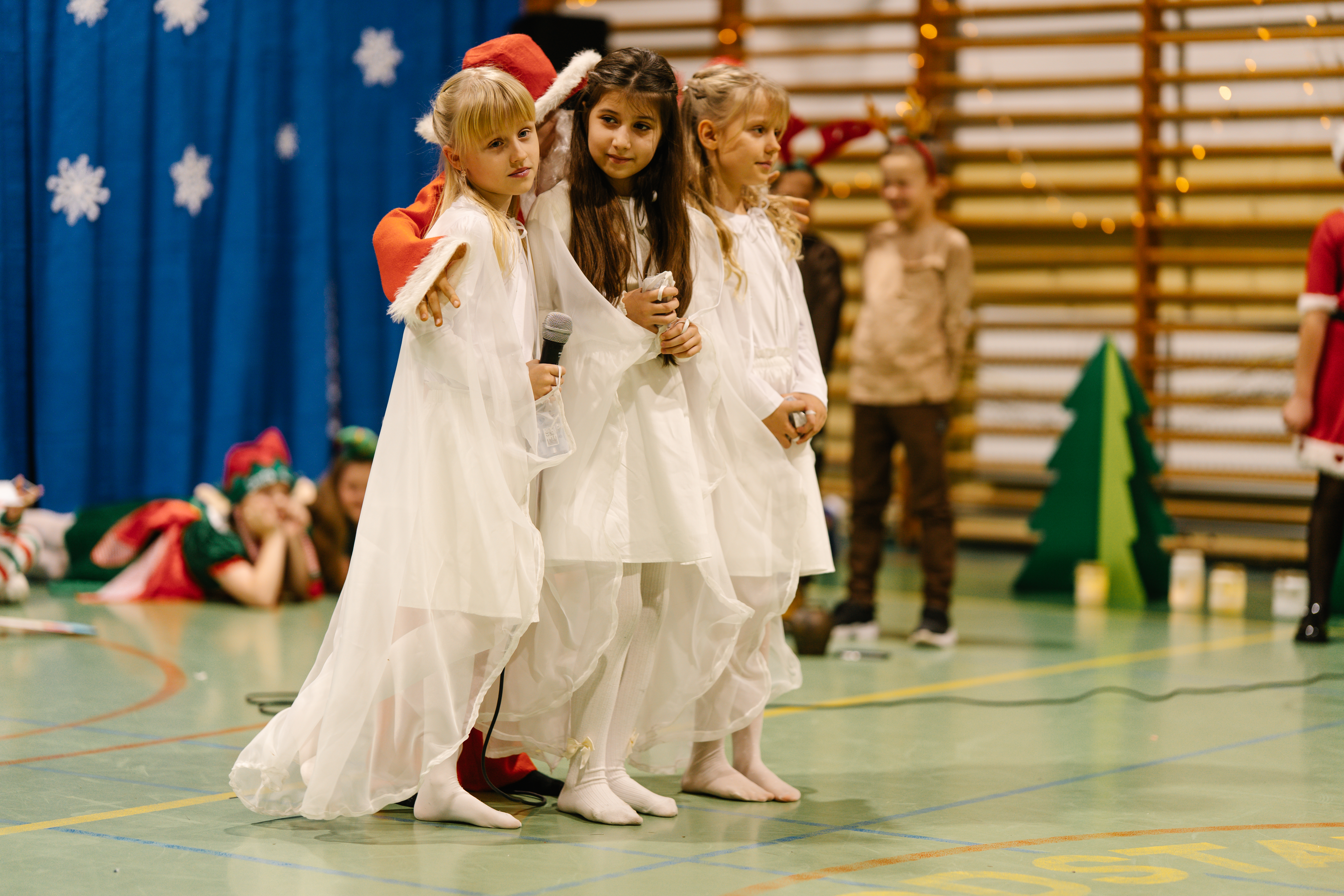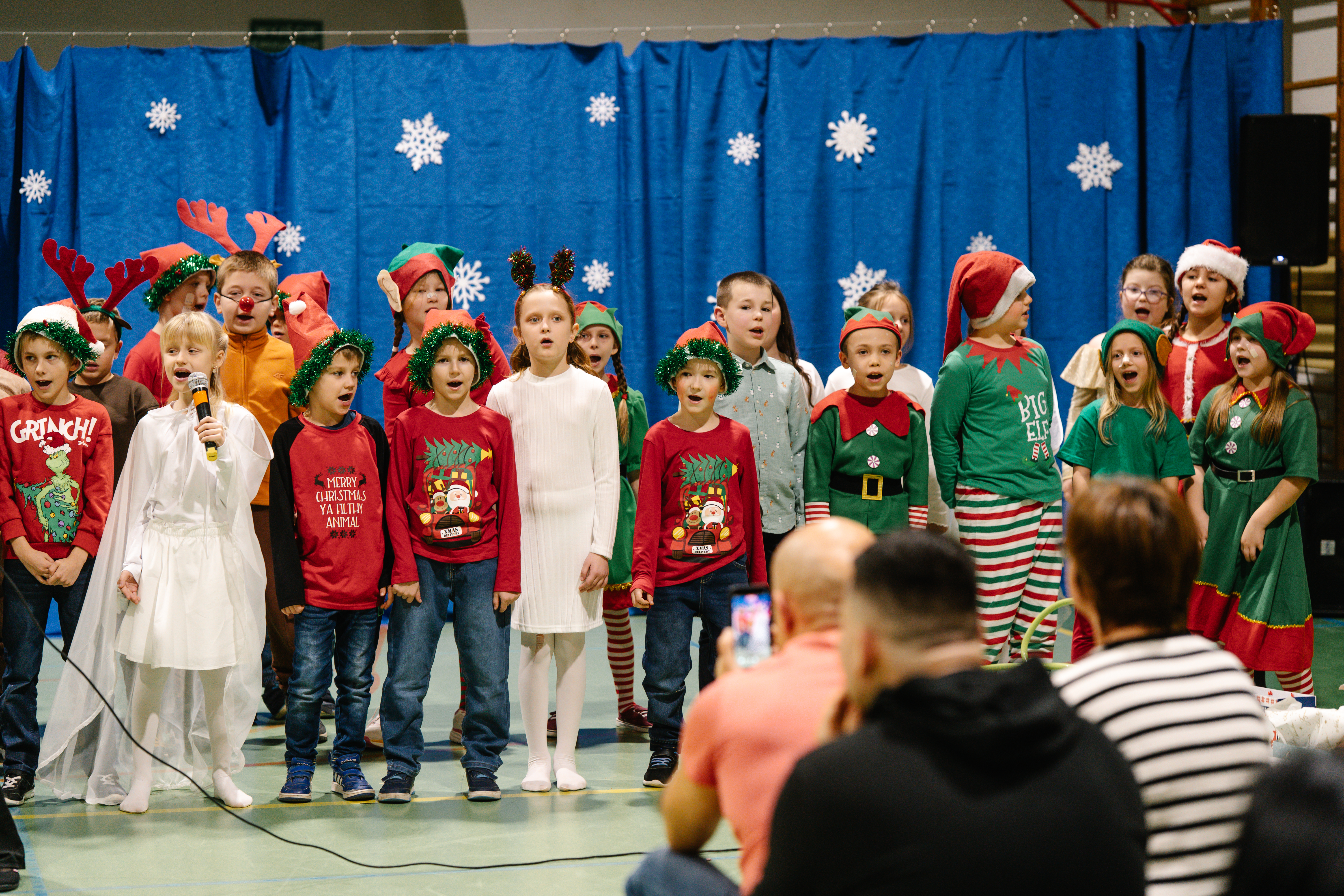 W ciepłej, świątecznej atmosferze, na udekorowanej sali gimnastycznej odbyło się wyjątkowe spotkanie świąteczne klas 2a, 2b i 2c z rodzicami. Już od progu uwagę przyciągały kolorowe dekoracje: migoczące lampki, papierowe gwiazdy oraz choinka. Na twarzach dzieci widać było lekką tremę, ale też ogromną radość – tego popołudnia miały bowiem zaprezentować długo przygotowywane przedstawienie pt. „Chore elfy”.