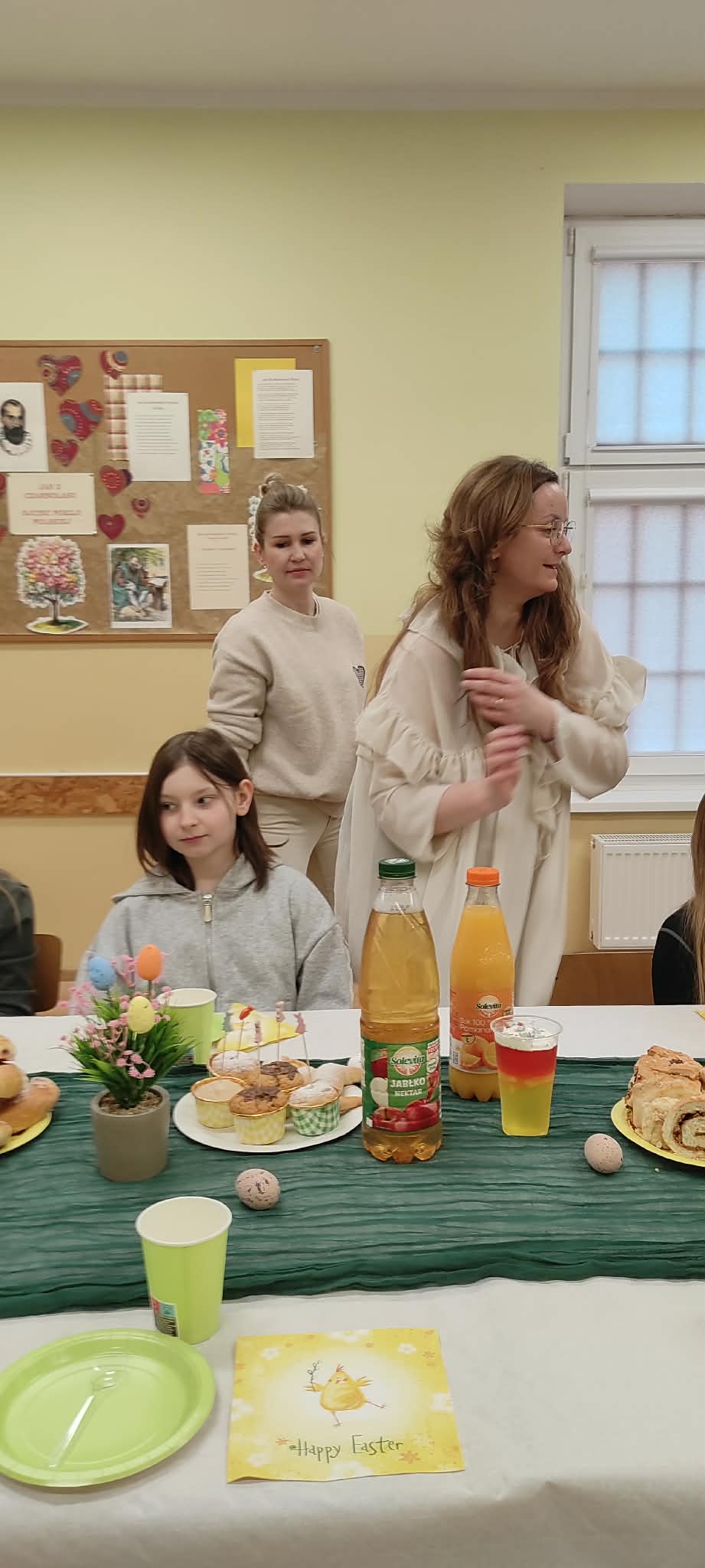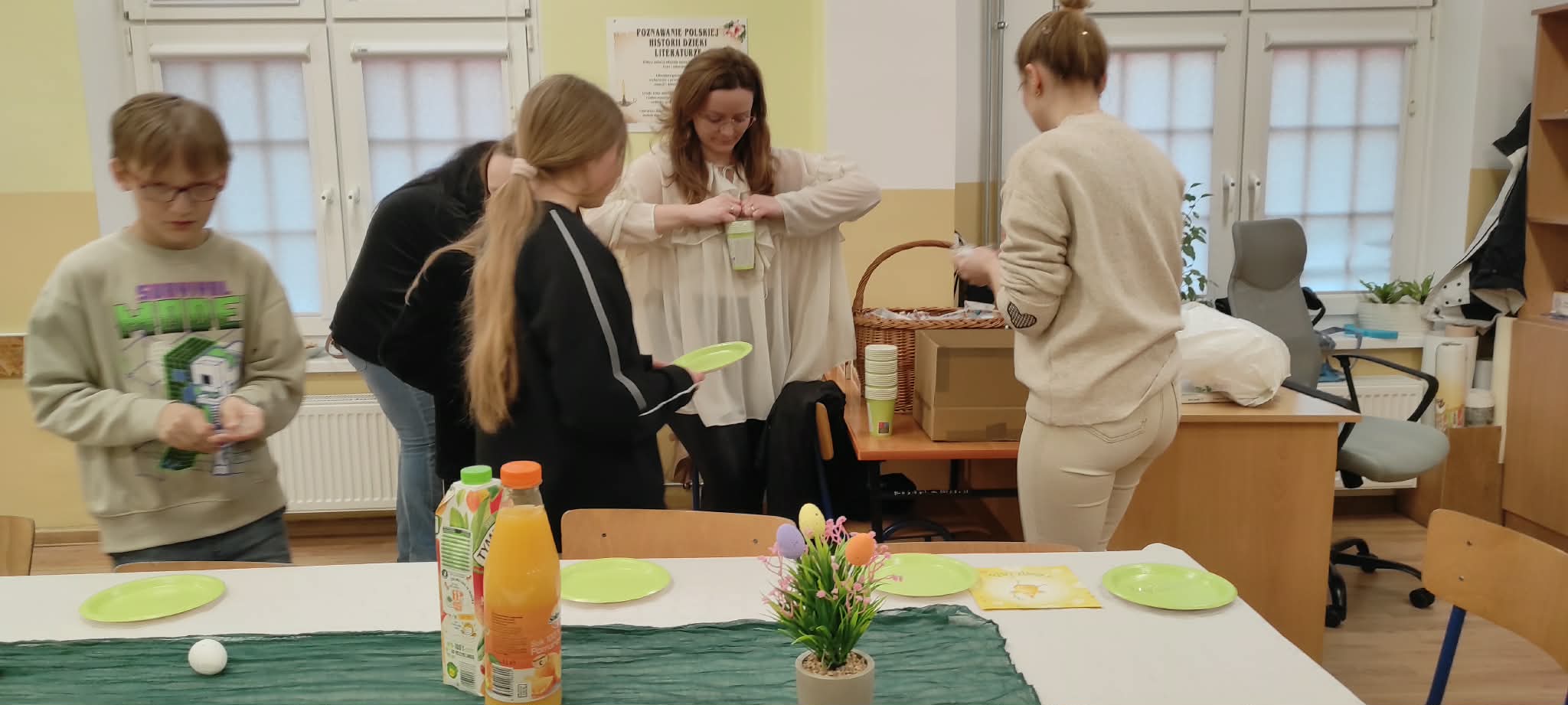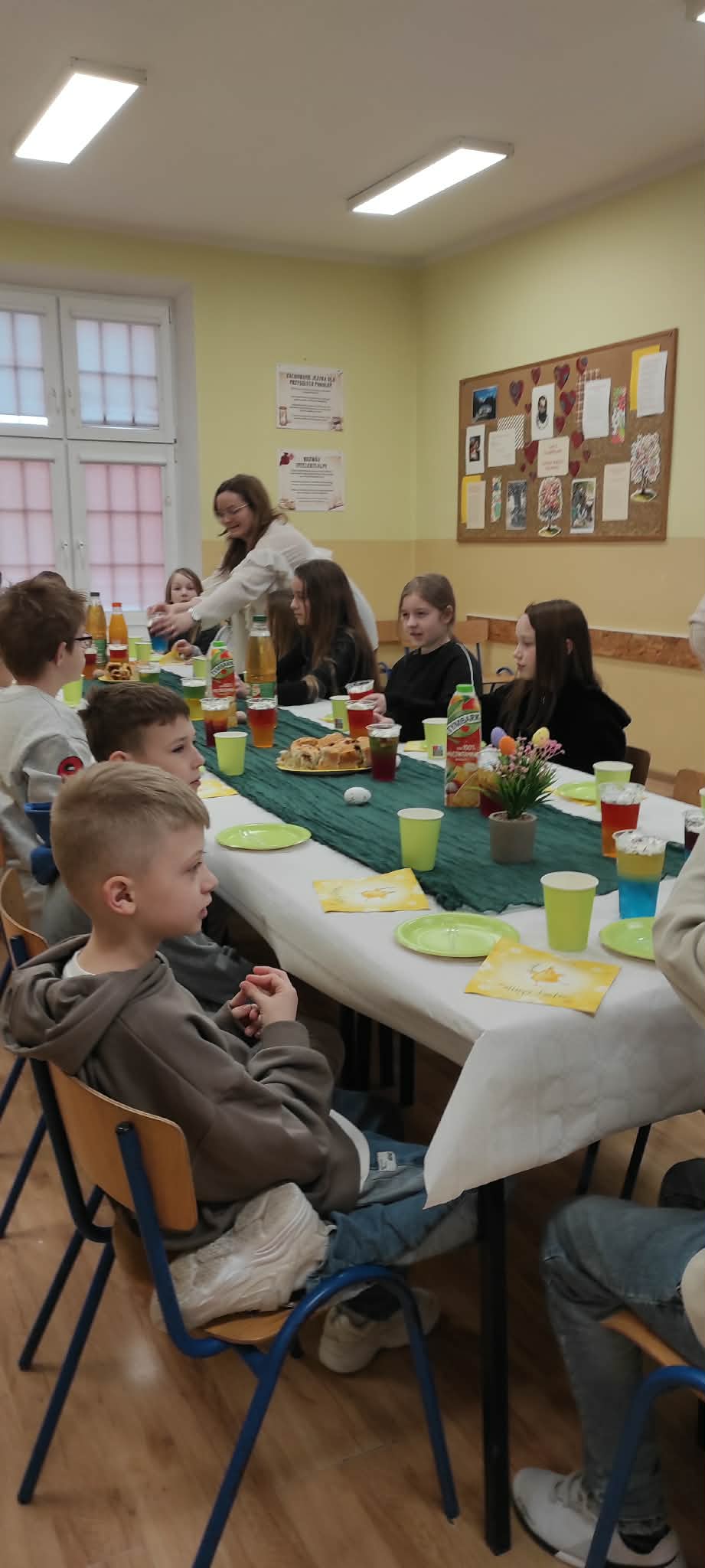 Uczniowie zasiedli do wielkanocnego stołu zastawionego słodkościami przygotowanymi przez mamy. Uczniowie z mamami zadbali również o wielkanocne dekoracje na stole. Następnie ozdabiali styropianowe jajka jako symbol tego radosnego święta. Na zakończenie złożyli sobie życzenia.