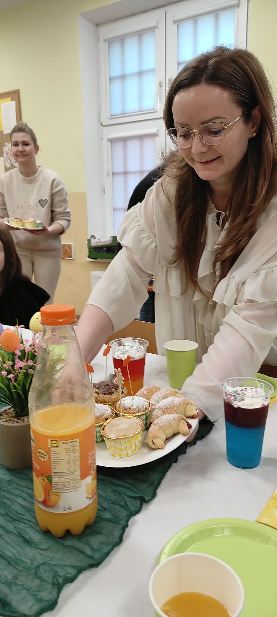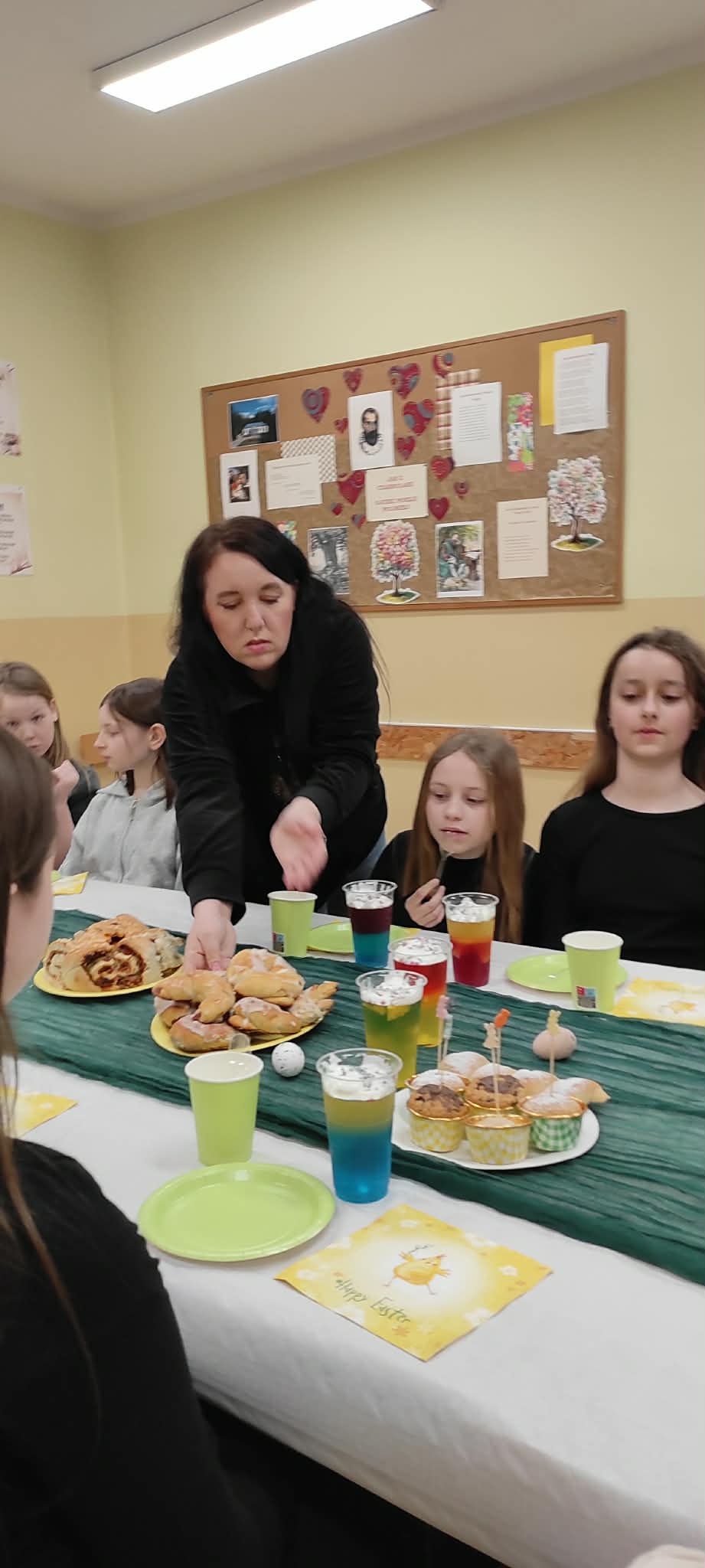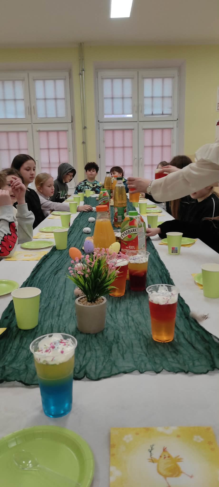 Uczniowie zasiedli do wielkanocnego stołu zastawionego słodkościami przygotowanymi przez mamy. Uczniowie z mamami zadbali również o wielkanocne dekoracje na stole. Następnie ozdabiali styropianowe jajka jako symbol tego radosnego święta. Na zakończenie złożyli sobie życzenia.