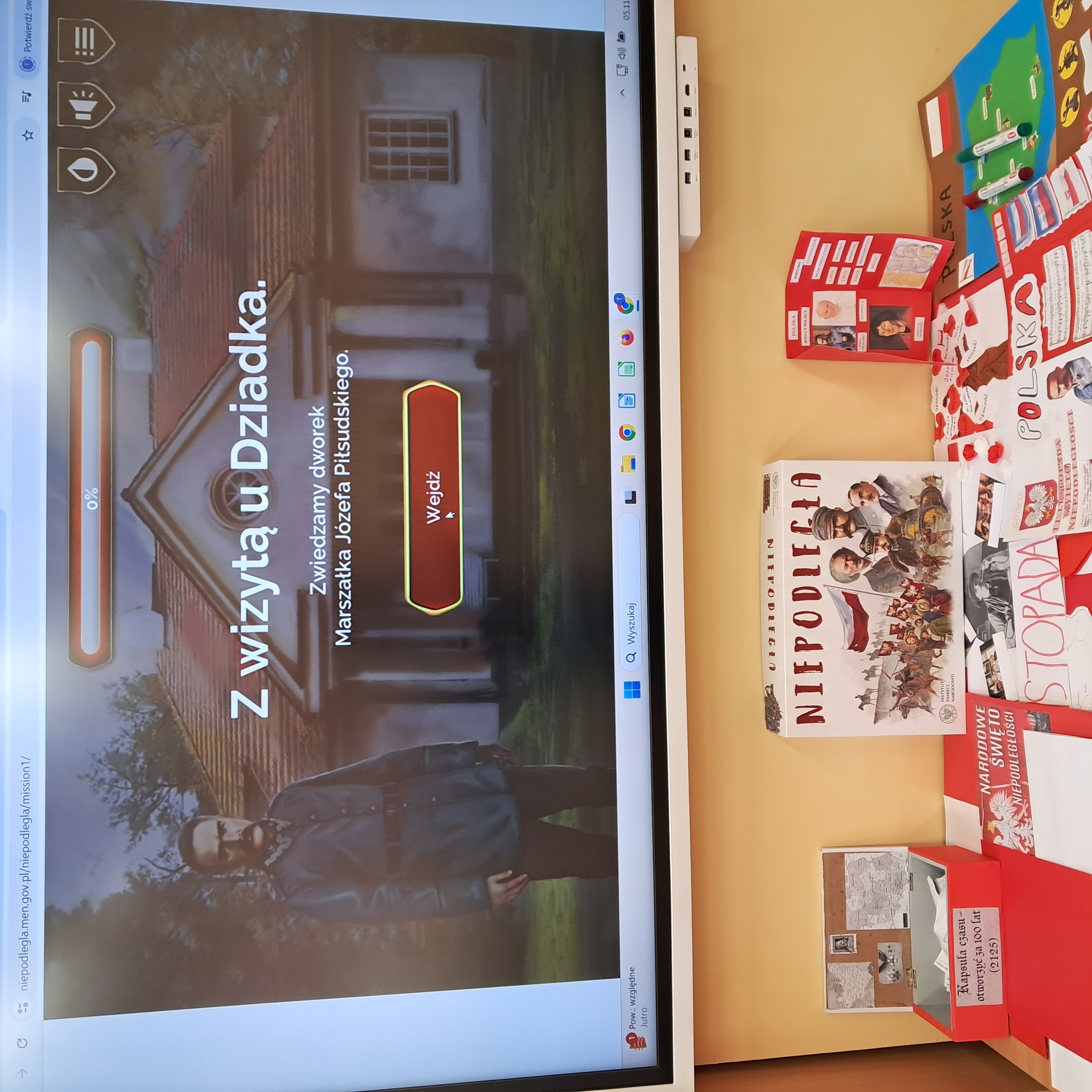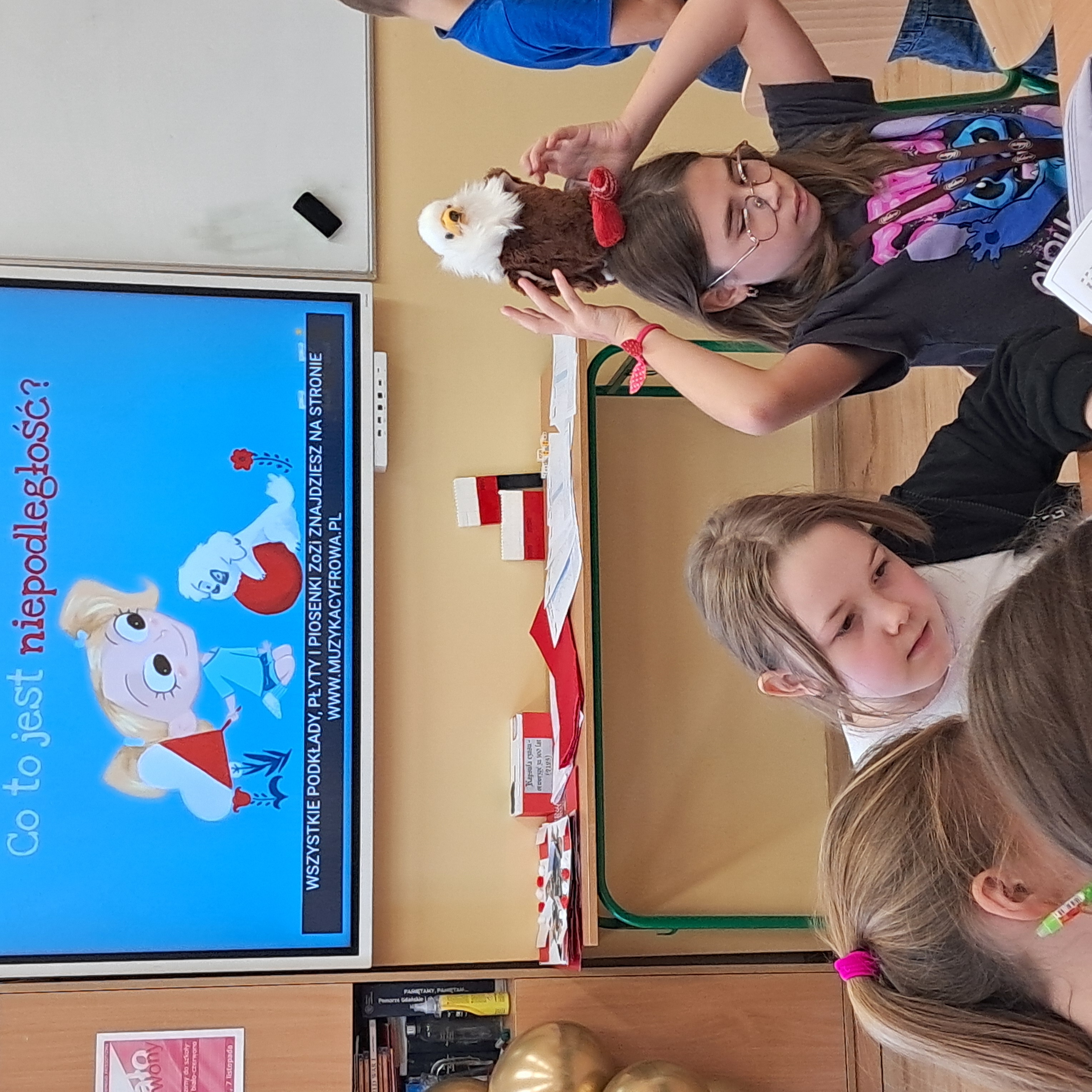 Uczniowie z klas 6a, 6b i 7c wraz z rodzicami i dziadkami, upiekli i ozdobili patriotyczne ciasteczka. Czwartoklasiści układali symbole narodowe z klocków lego i malowali kolorowanki przedstawiające Ojców Niepodległości. Dzieci obejrzały film animowany historia Kasztanki ukochanego konia marszałka Piłsudskiego oraz wykonały figurki z kasztanów. W trakcie zajęć uczniowie rozwiązywali krzyżówki, wykreślanki, quizy o tematyce związanej z historią Polski. Zajęciom towarzyszyły maskotki – orzełek i bocianek w specjalnie na ten dzień wydzierganych na drutach skarpeteczkach.