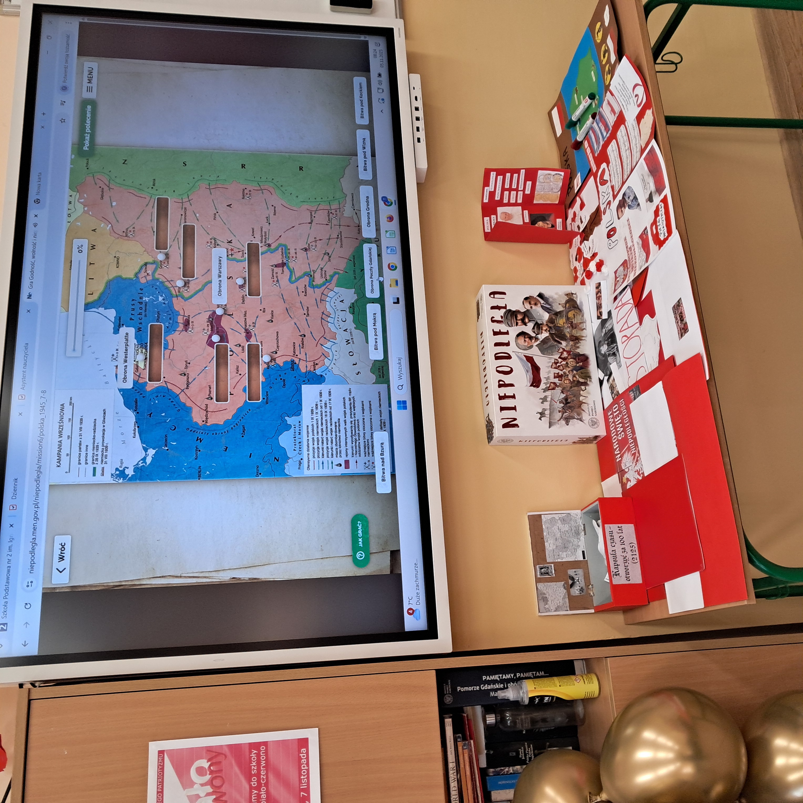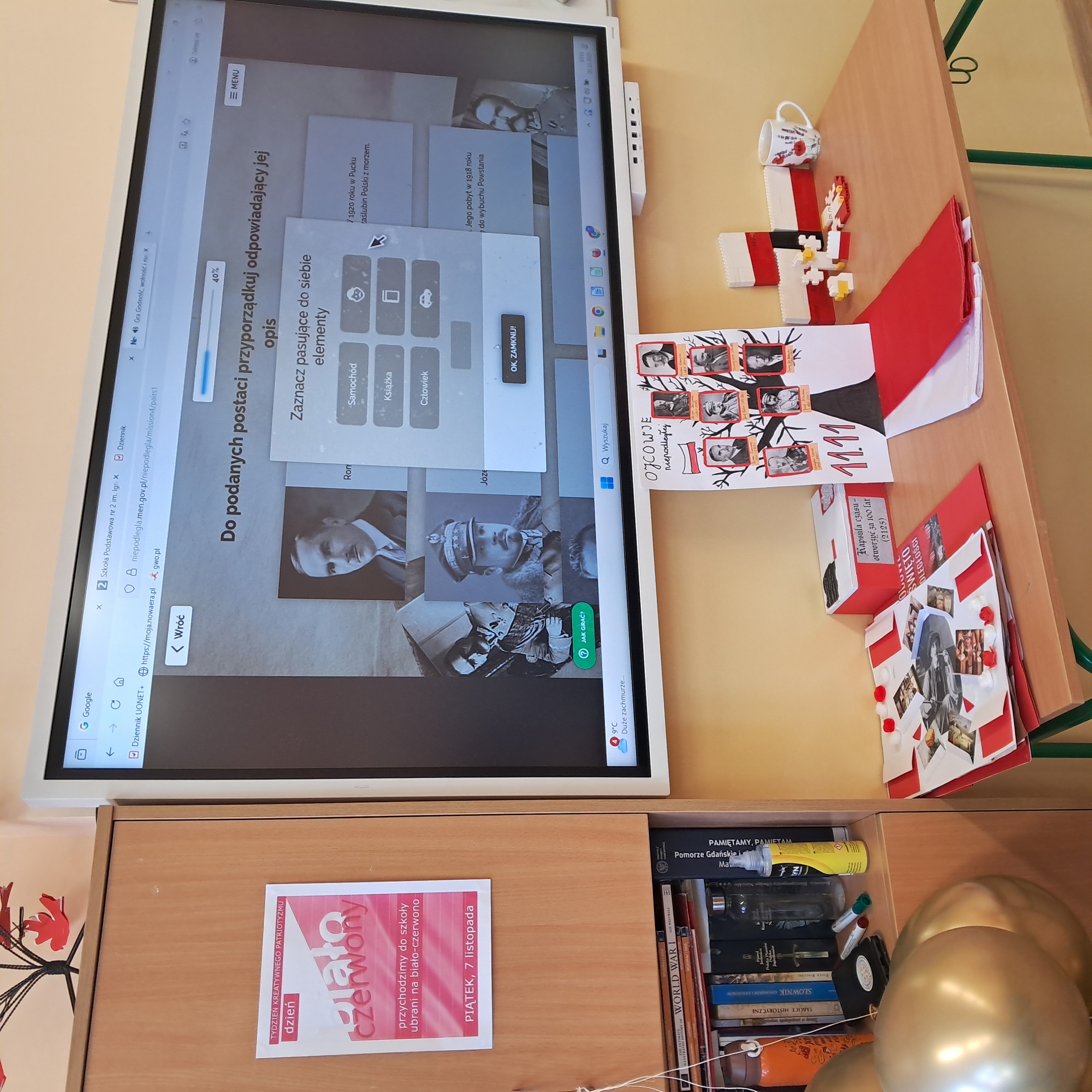 Piątek 7 listopada był dniem w barwach narodowych. Wielu uczniów, nauczycieli i pracowników szkoły odpowiedziało na zaproszenie Koła Historycznego i przyszło ubranych na biało-czerwono. W salach lekcyjnych i na korytarzach pojawiły się okolicznościowe gazetki tematyczne, a w trakcie lekcji wychowawczych i wszystkich innych zajęć rozmawiano o dawnej i współczesnej Polsce oraz o małej ojczyźnie Malborku. W całej szkole czuć było radosną atmosferę święta.