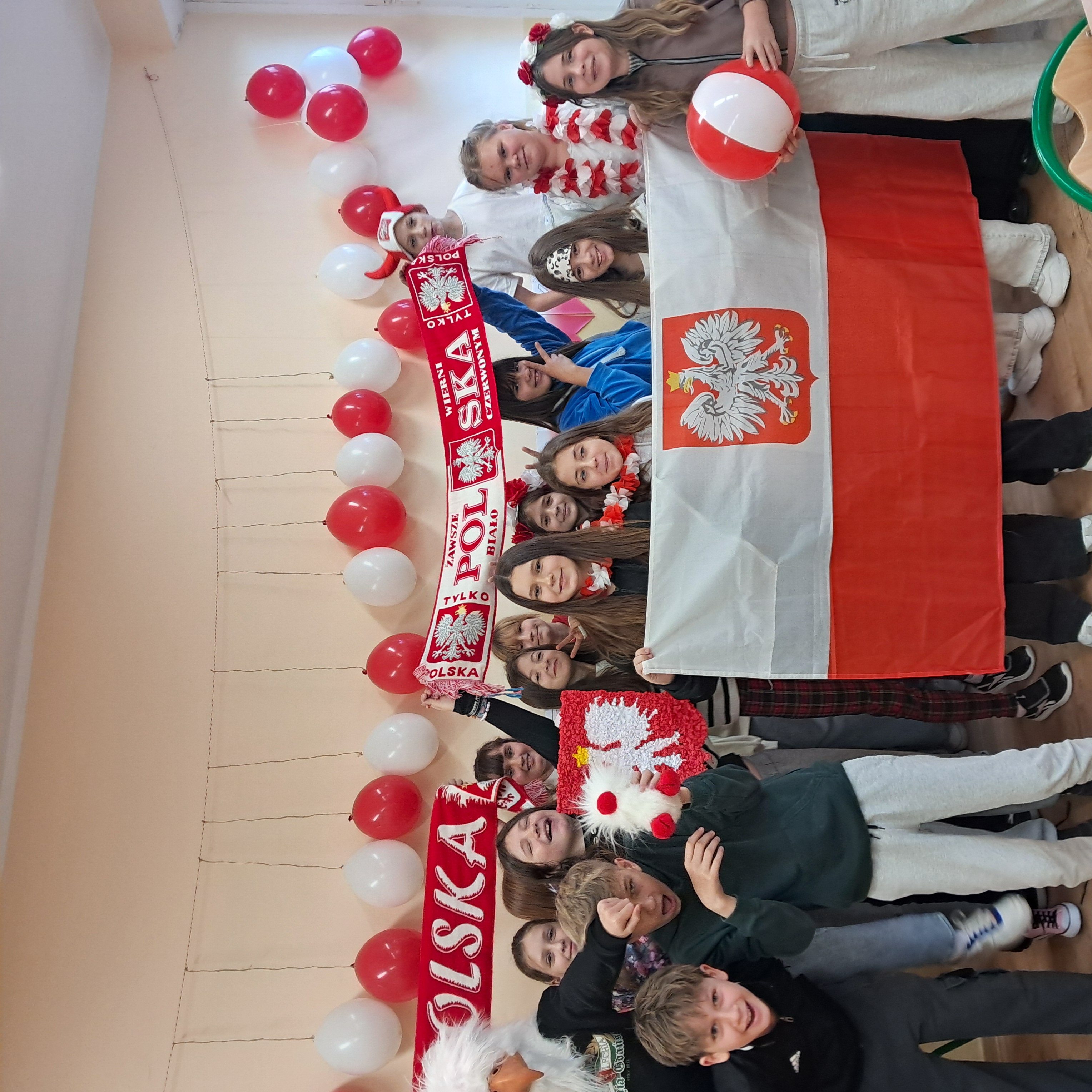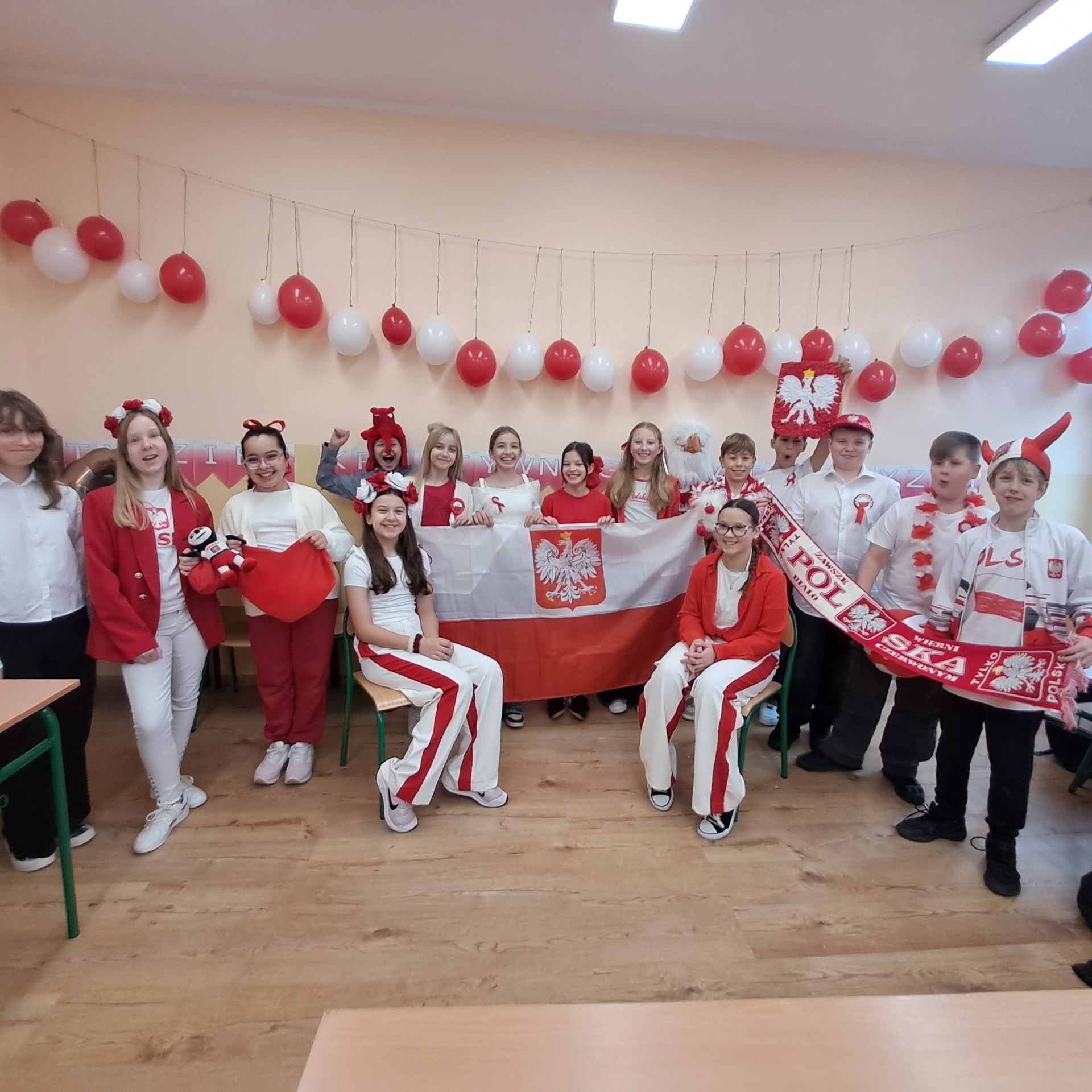 Uczniowie z klas I-III wraz ze swoimi wychowawcami spotkali się w pięknie udekorowanej sali gimnastycznej na festiwalu pieśni i piosenek patriotycznych, o czym przeczytamy w specjalnej relacji. Tego dnia dzieci przyszły ubrane na galowo. Były kotyliony, wianki w biało czerwonych barwach i radosne uśmiechy. W szkolnej świetlicy również panowała radosna atmosfera i można było podziwiać kreatywne prace plastyczne wykonane pod czujnym okiem nauczycieli.