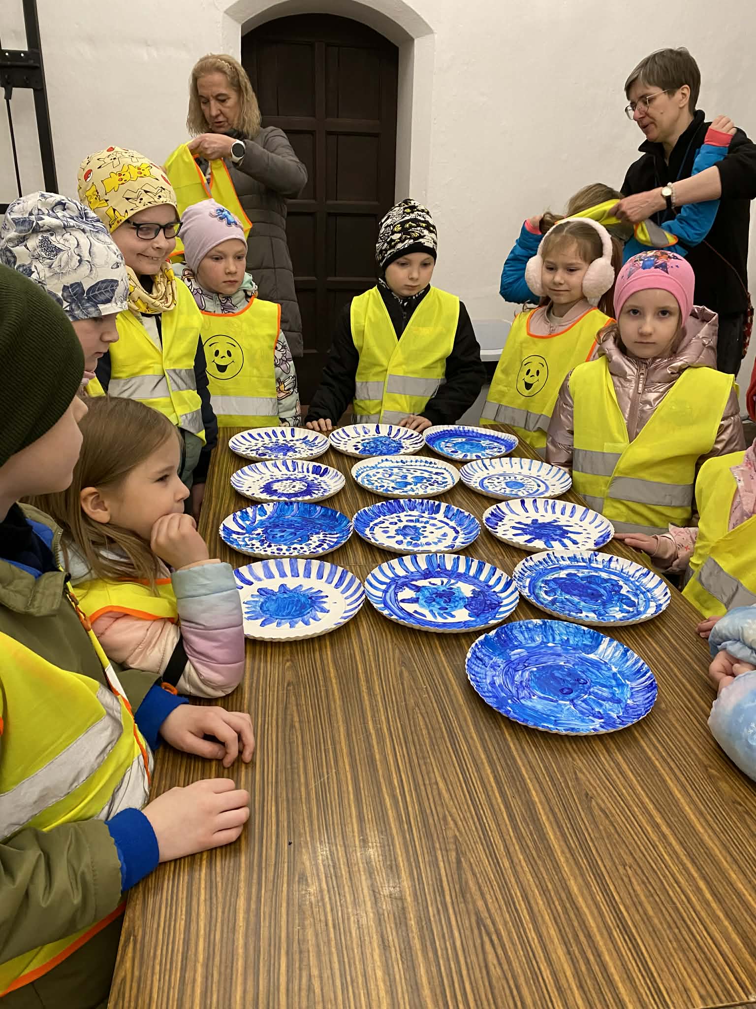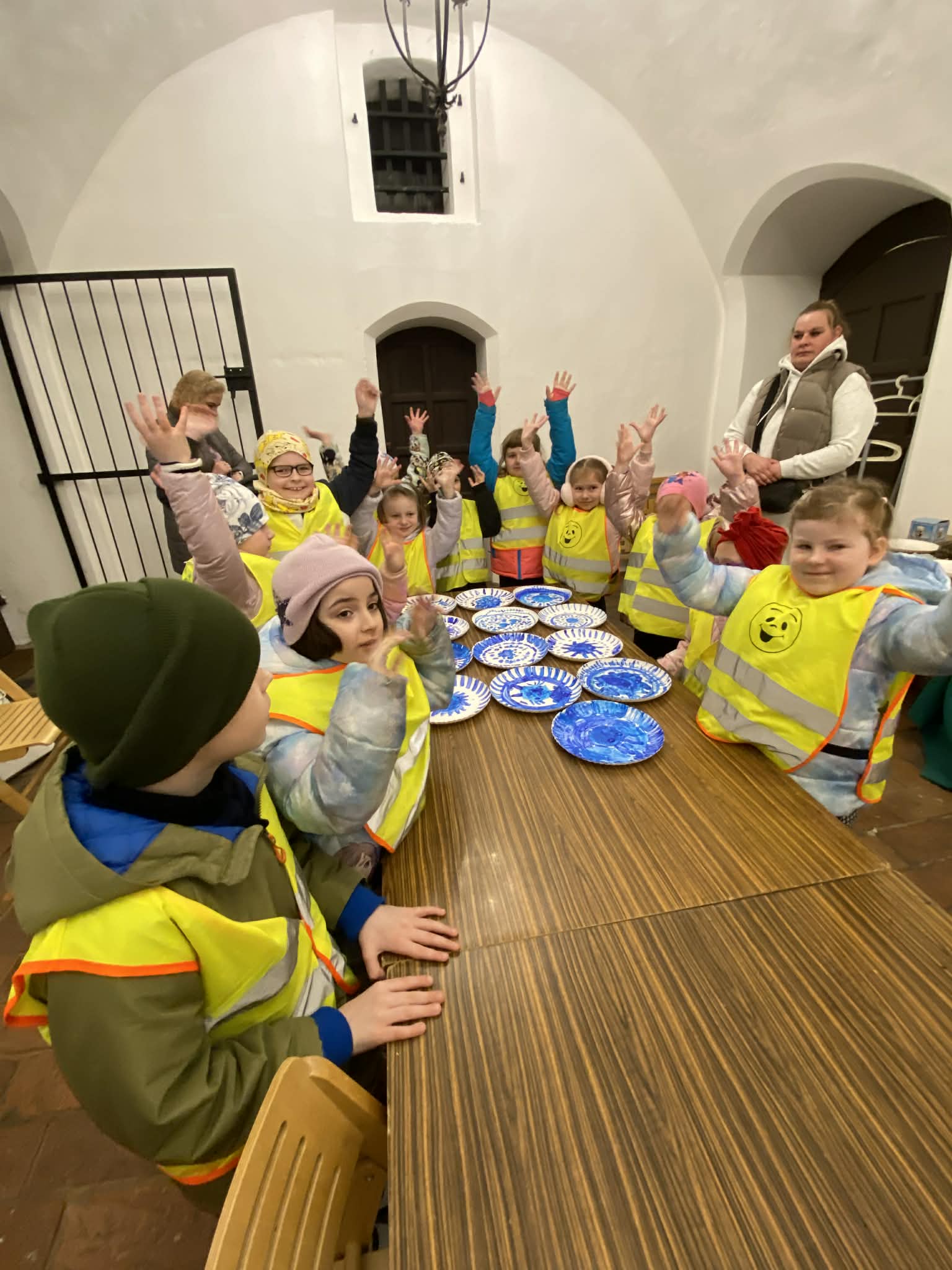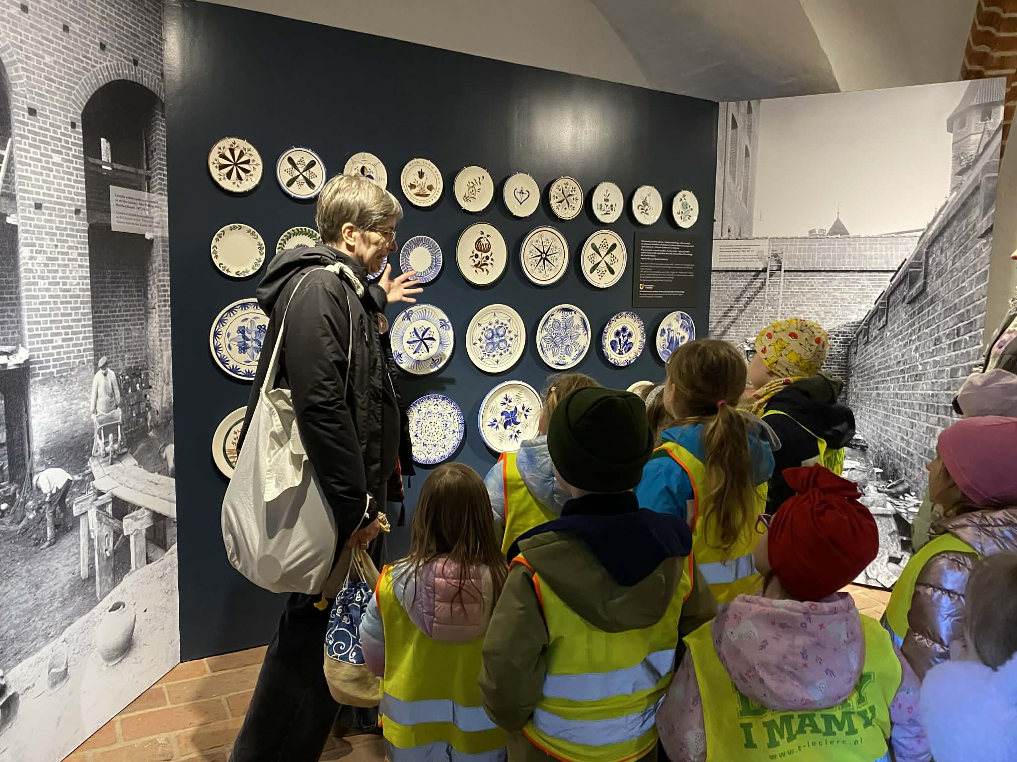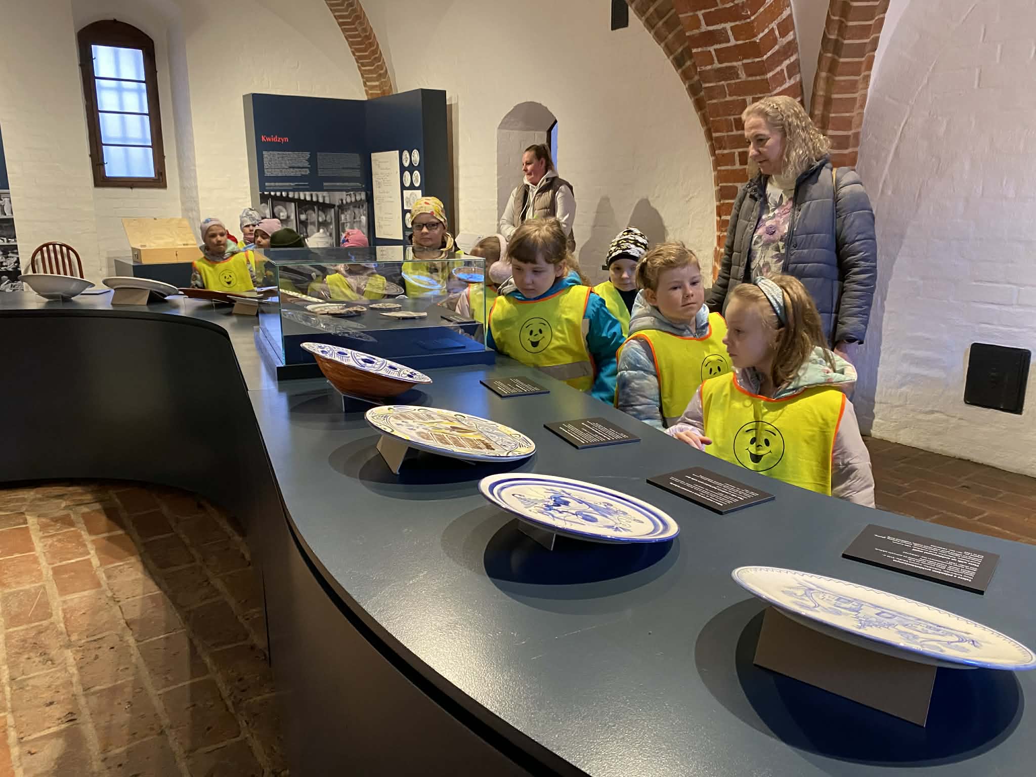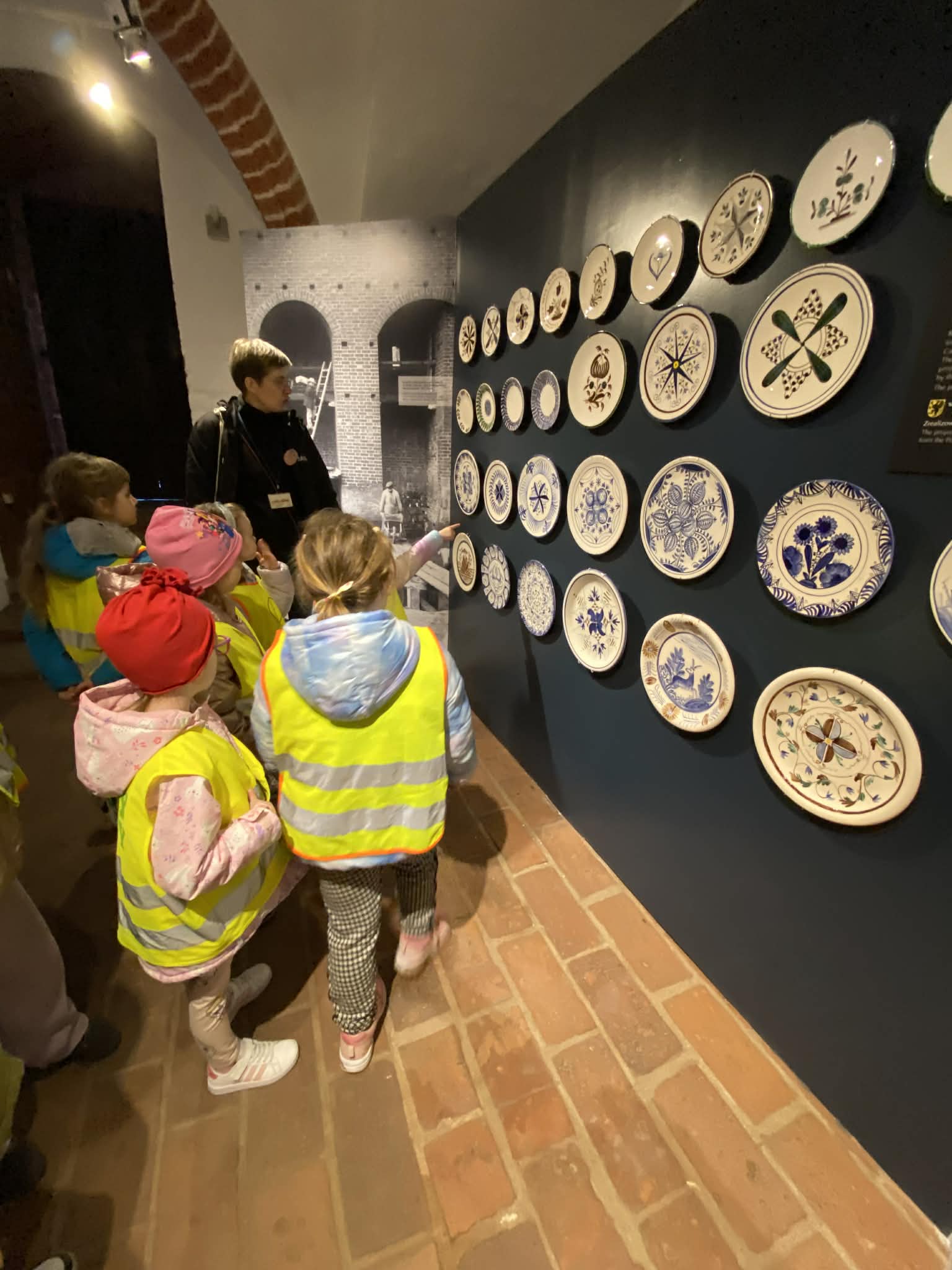 W miniony czwartek dzieci z oddziału przedszkolnego uczestniczyły w zajęciach muzealnych z panią Magdaleną Olbryś na temat „Dawnych przedmiotów codziennego użytku” . Prowadząca zajęcia zabrała dzieci do pomieszczeń w zamku, gdzie mogły zobaczyć i podziwiać kolekcję dawnych wyrobów ceramicznych. W sali „Pod Dębem” dzieci zwiedziły również wystawę „Zaginione formy”, która była poświęcona talerzom fajansu pomorskiego. Na koniec przedszkolaki ozdabiały farbami według własnego pomysłu papierowy talerzyk.