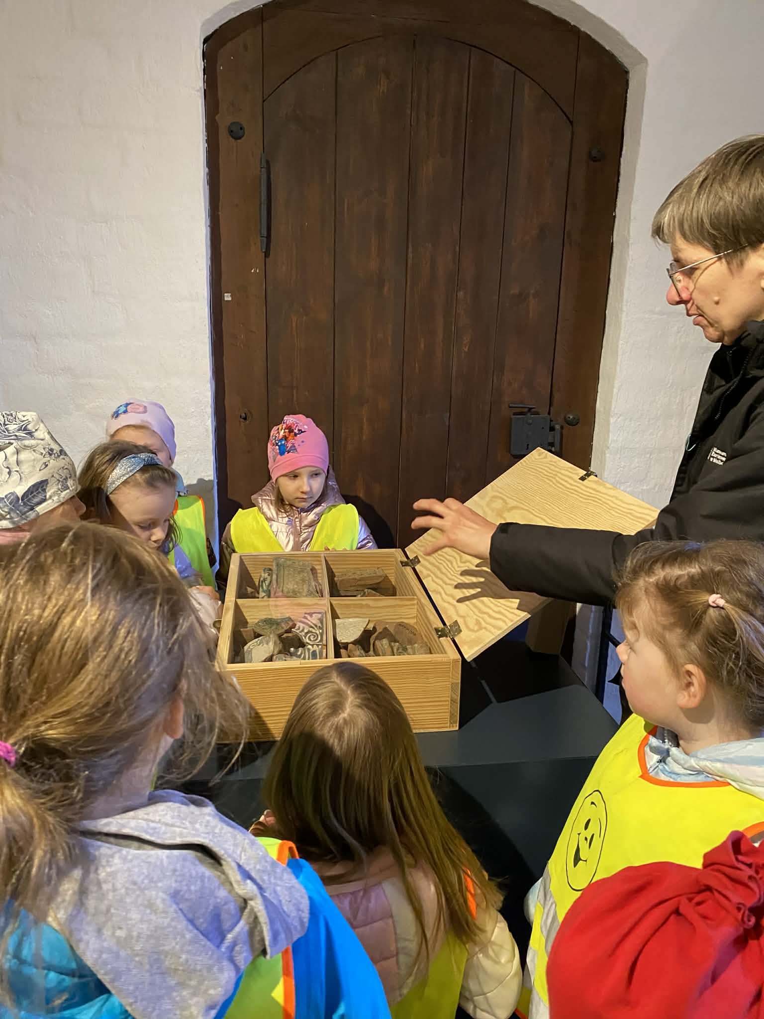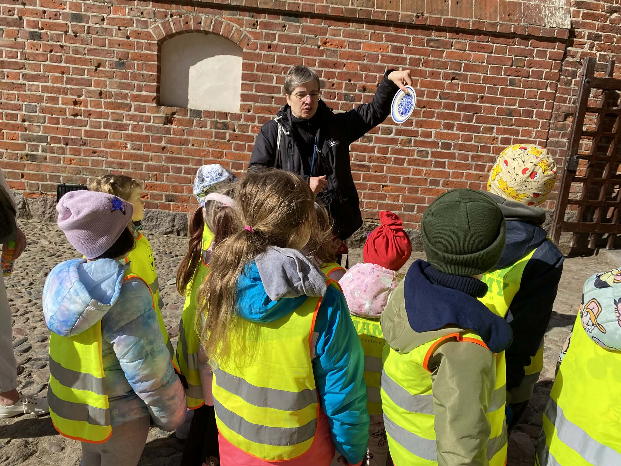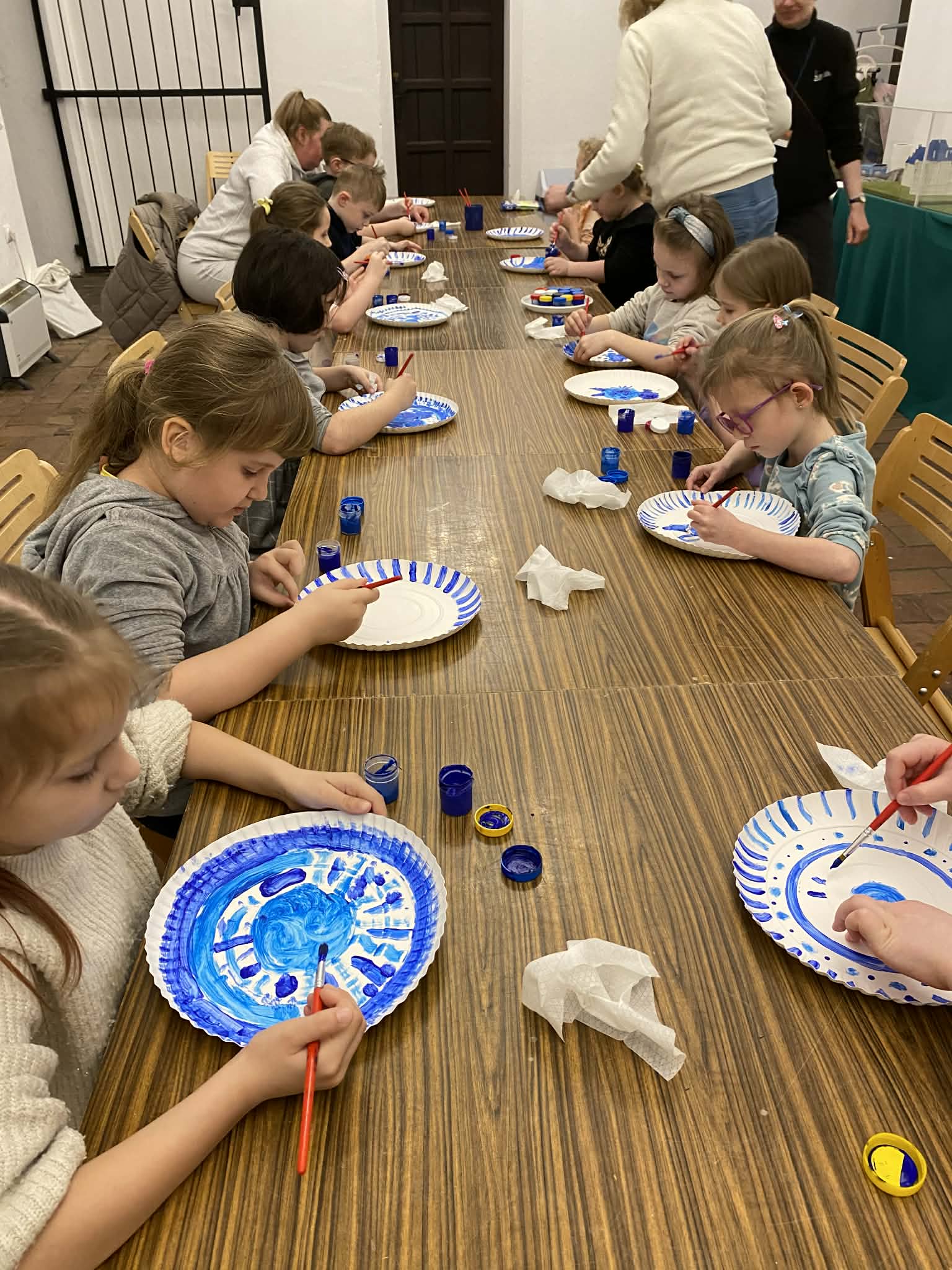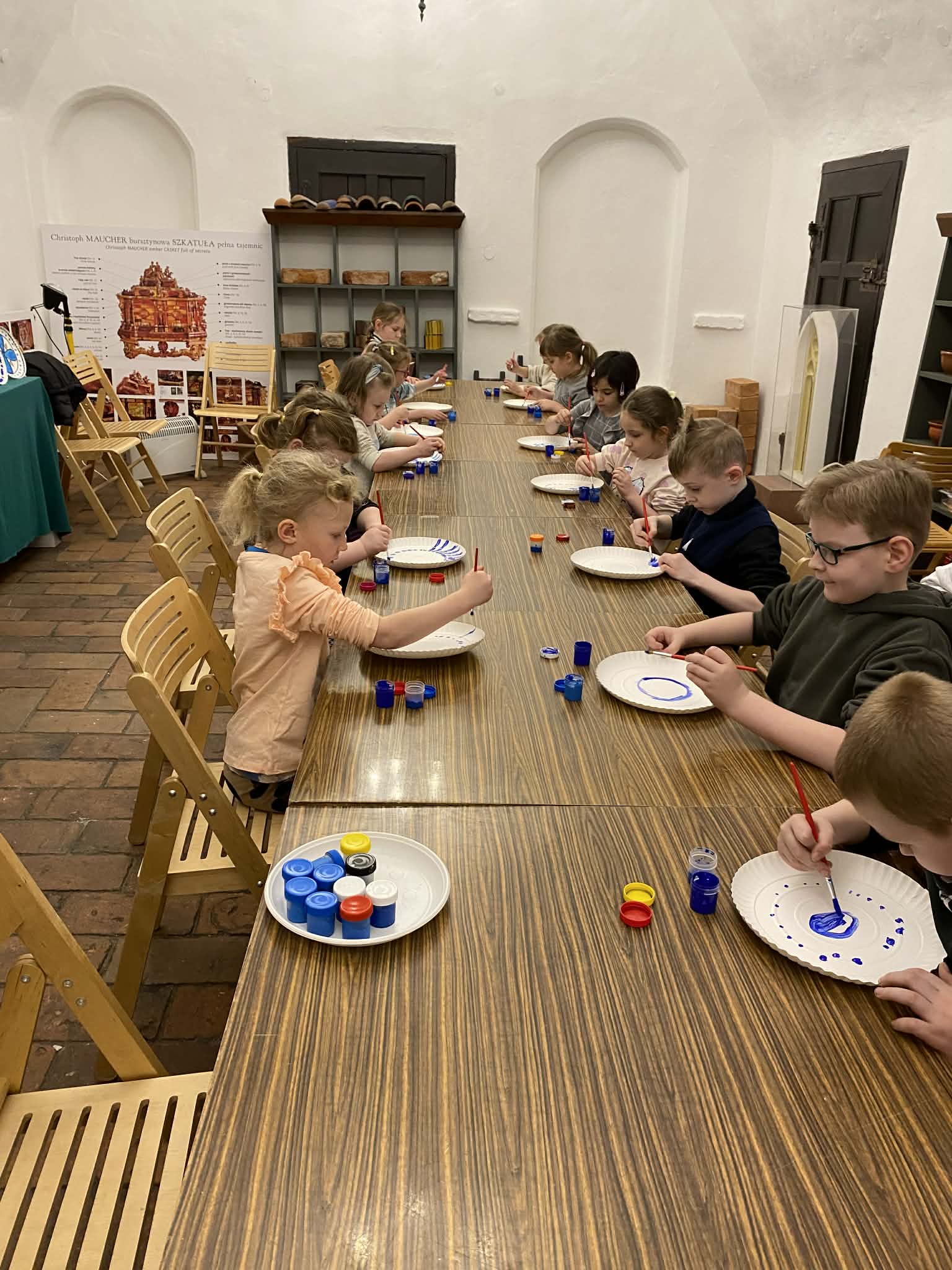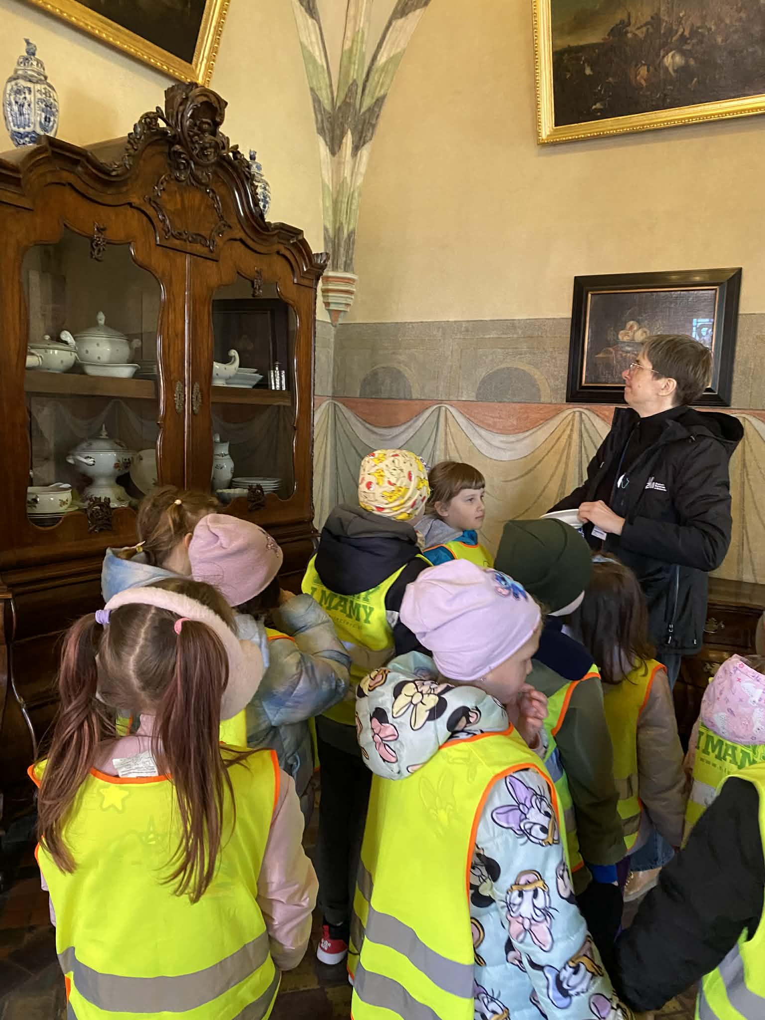 W miniony czwartek dzieci z oddziału przedszkolnego uczestniczyły w zajęciach muzealnych z panią Magdaleną Olbryś na temat „Dawnych przedmiotów codziennego użytku” . Prowadząca zajęcia zabrała dzieci do pomieszczeń w zamku, gdzie mogły zobaczyć i podziwiać kolekcję dawnych wyrobów ceramicznych. W sali „Pod Dębem” dzieci zwiedziły również wystawę „Zaginione formy”, która była poświęcona talerzom fajansu pomorskiego. Na koniec przedszkolaki ozdabiały farbami według własnego pomysłu papierowy talerzyk.