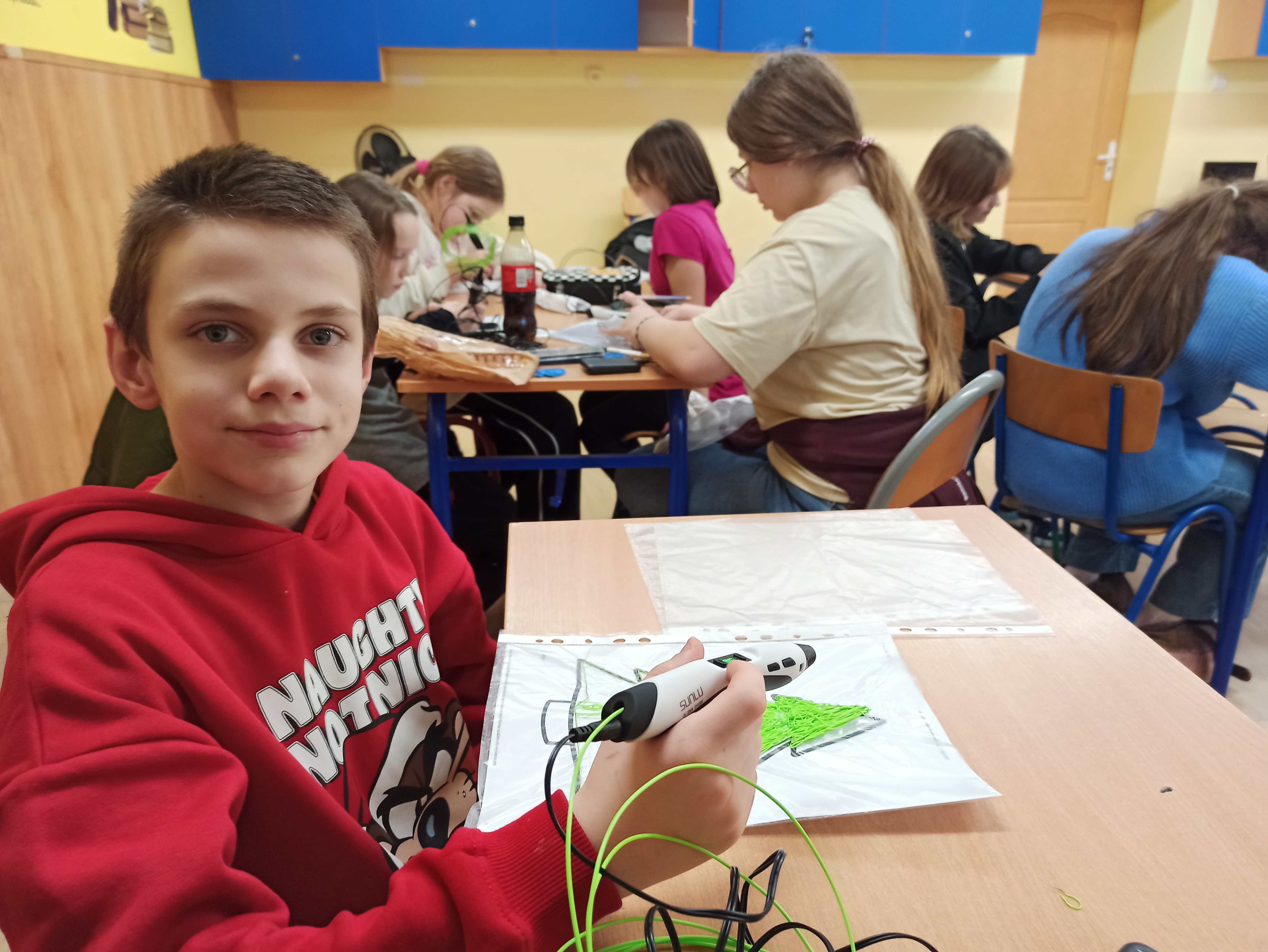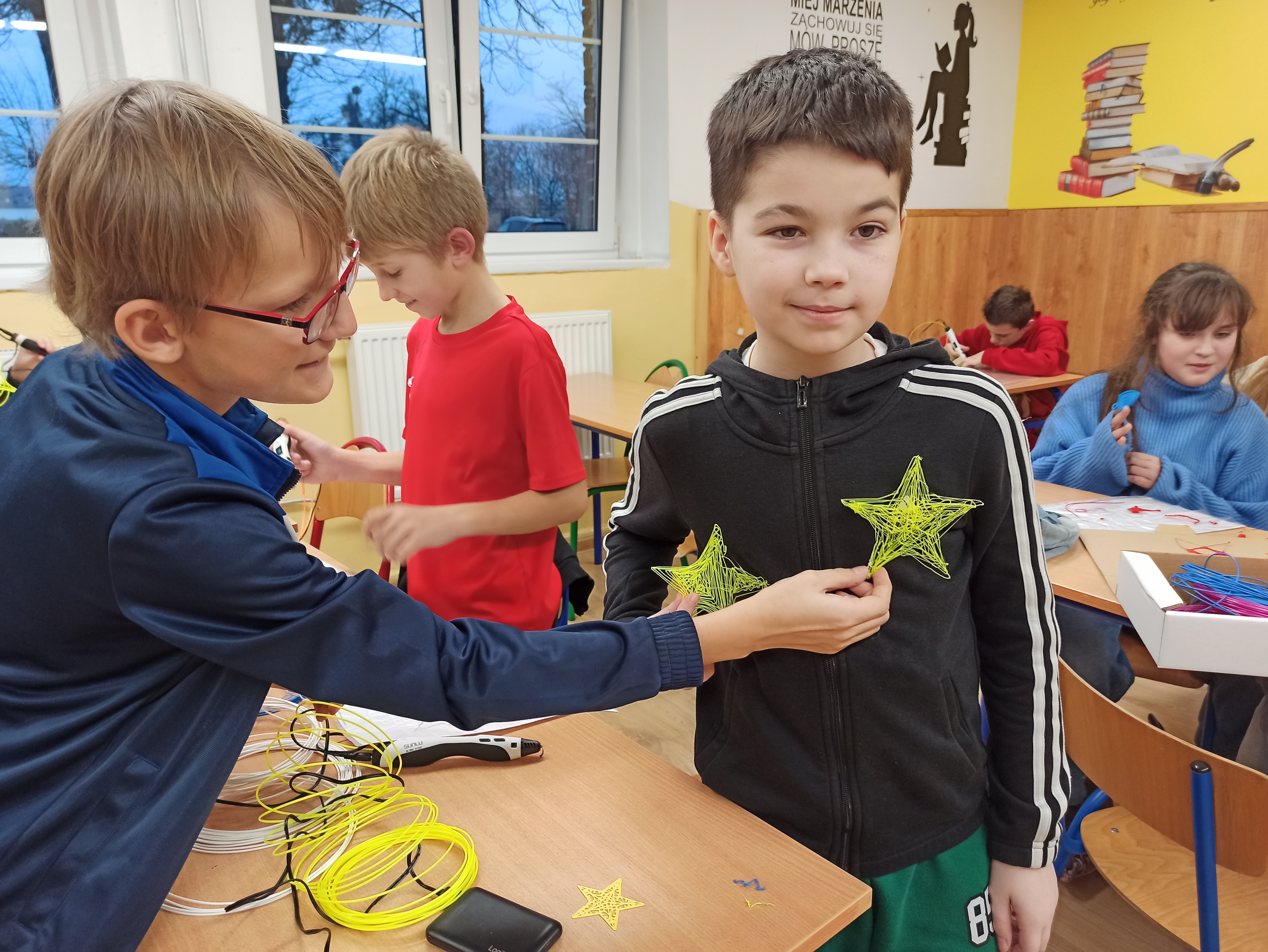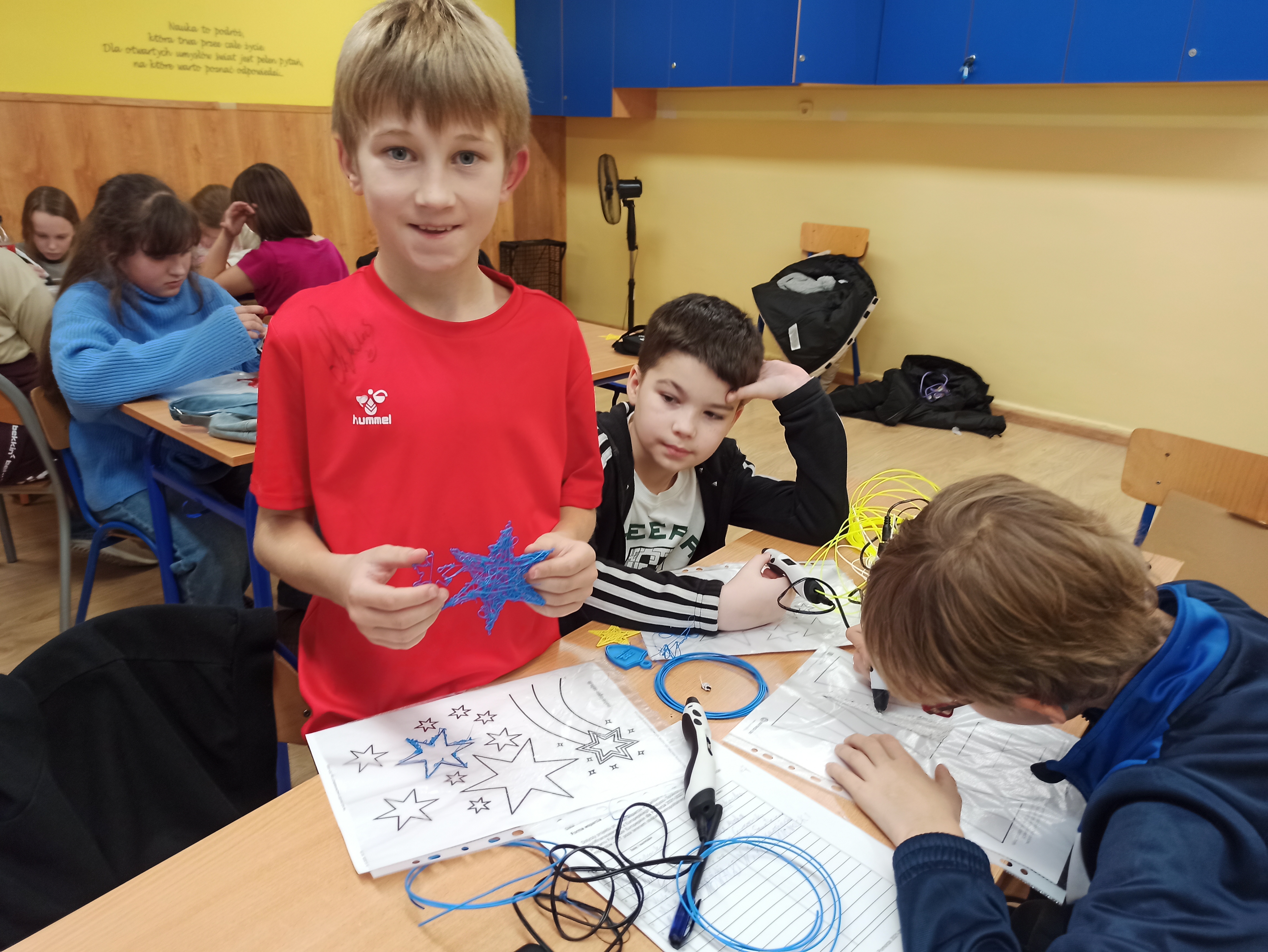 Tym razem tematyką zajęć był druk 3D. Po krótkim szkoleniu BHP, uczniowie zapoznali się z różnymi technikami druku 3d oraz poznali narzędzia i materiały potrzebne do tworzenia trójwymiarowych figur. Najciekawszym punktem zajęć była jednak samodzielna praca, podczas której można było stworzyć oryginalne dekoracje świąteczne, wykorzystując dostępne szablony lub projektując własne. Uczniowie ćwiczyli kreatywność, wyobraźnię przestrzenną i koordynację wzrokowo-ruchową. Przede wszystkim jednak świetnie się bawili w miłej atmosferze.
